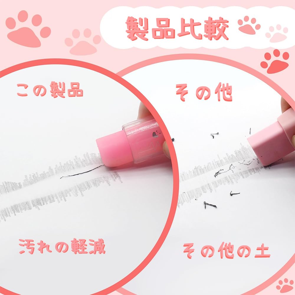 スティック消しゴム:スティック消しゴムは、上部に猫の肉球をあしらった愛らしいデザインのケースで、より愛らしく繊細な印象を与えます。抜群の消去性能と快適な消し心地で、鉛筆の跡を簡単に消すことができます。間違った鉛筆の書き跡をやさしく消します。