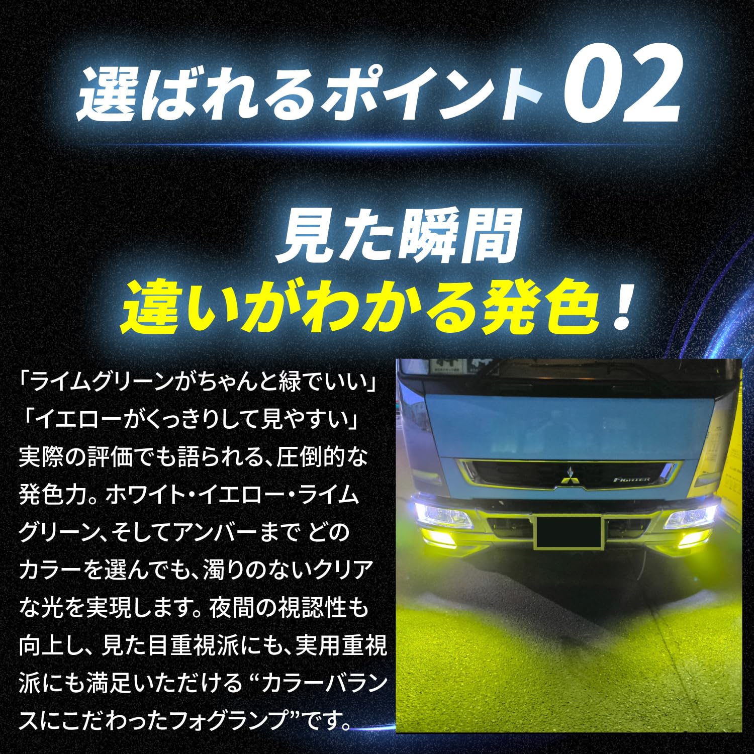 ?【見た瞬間 違いがわかる発色】「ライムグリーンがちゃんと緑でいい」 「イエローがくっきりして見やすい」 実際の評価でも語られる、圧倒的な発色力。 ホワイト・イエロー・ライムグリーン、そしてアンバーまで どのカラーを選んでも、濁りのないクリアな光を実現します。 夜間の視認性も向上し、 見た目重視派にも、実用重視派にも満足いただける **“カラーバランスにこだわったフォグランプ”**です。