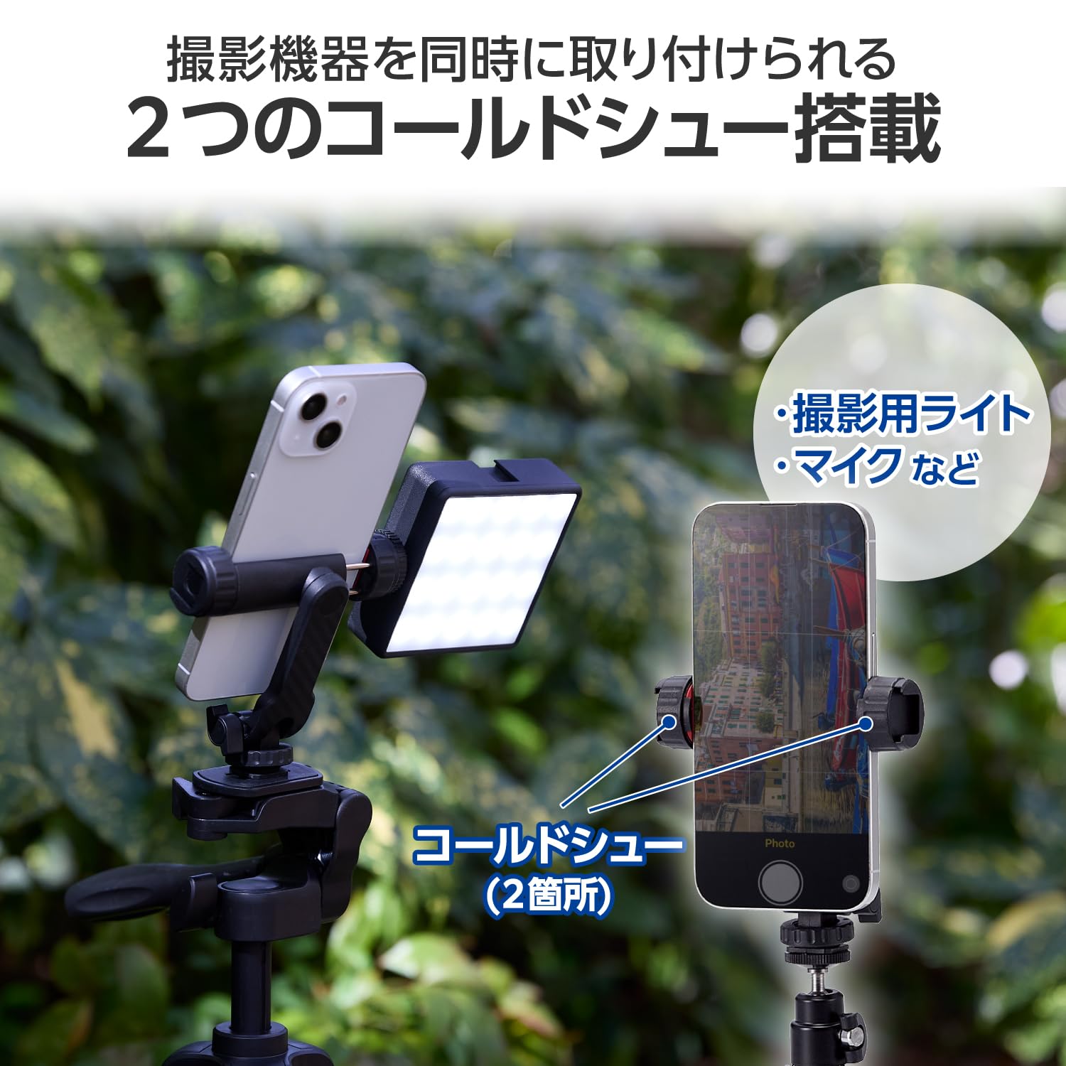 ■マイクや写真用のライトなどの機器を同時に取り付けられるコールドシューが2つ付いています。