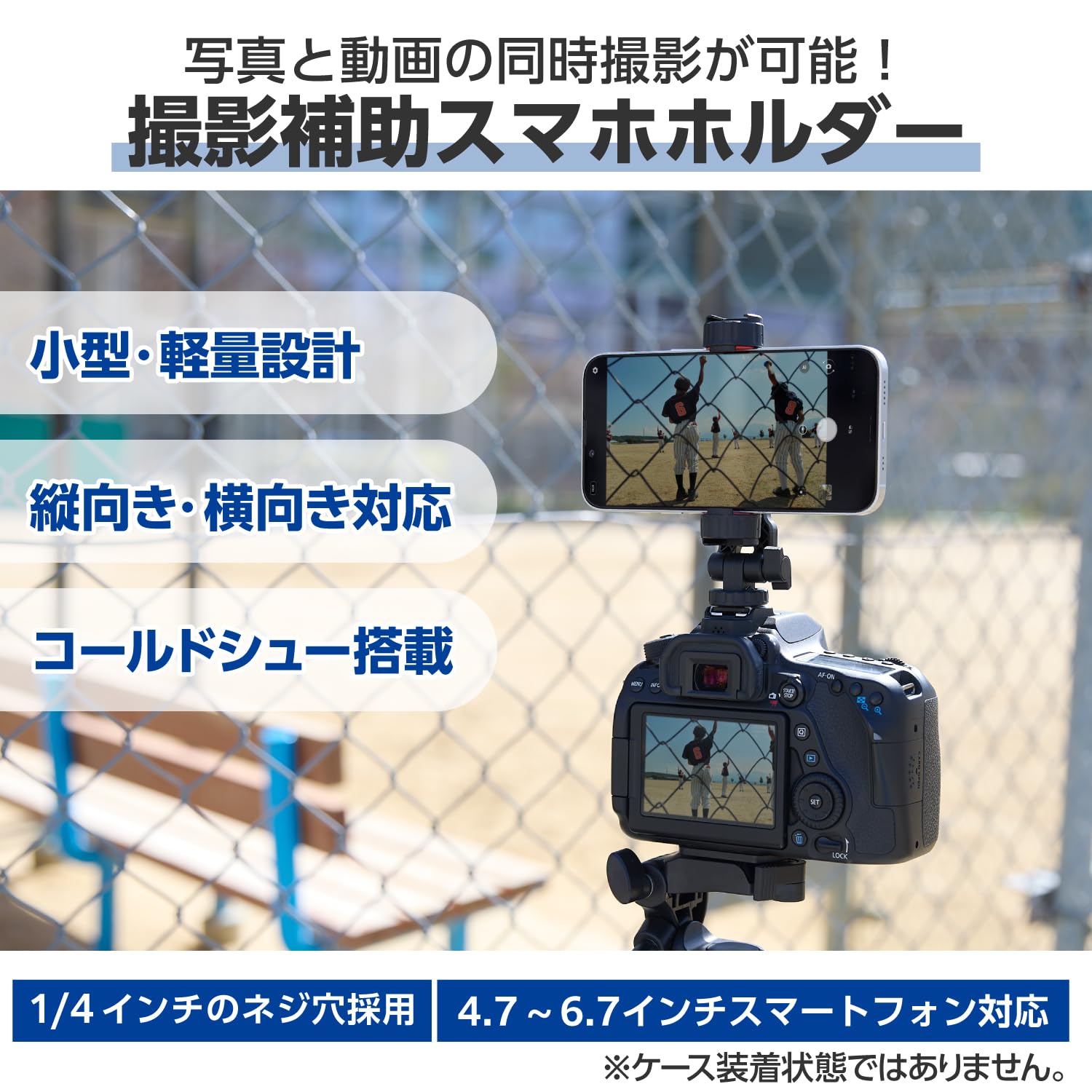 一眼レフカメラ上部にあるアクセサリーシューに取り付け、ネジで締めて固定することが可能。一眼レフカメラで写真を撮りながらスマートフォンで同時に動画の撮影ができます。