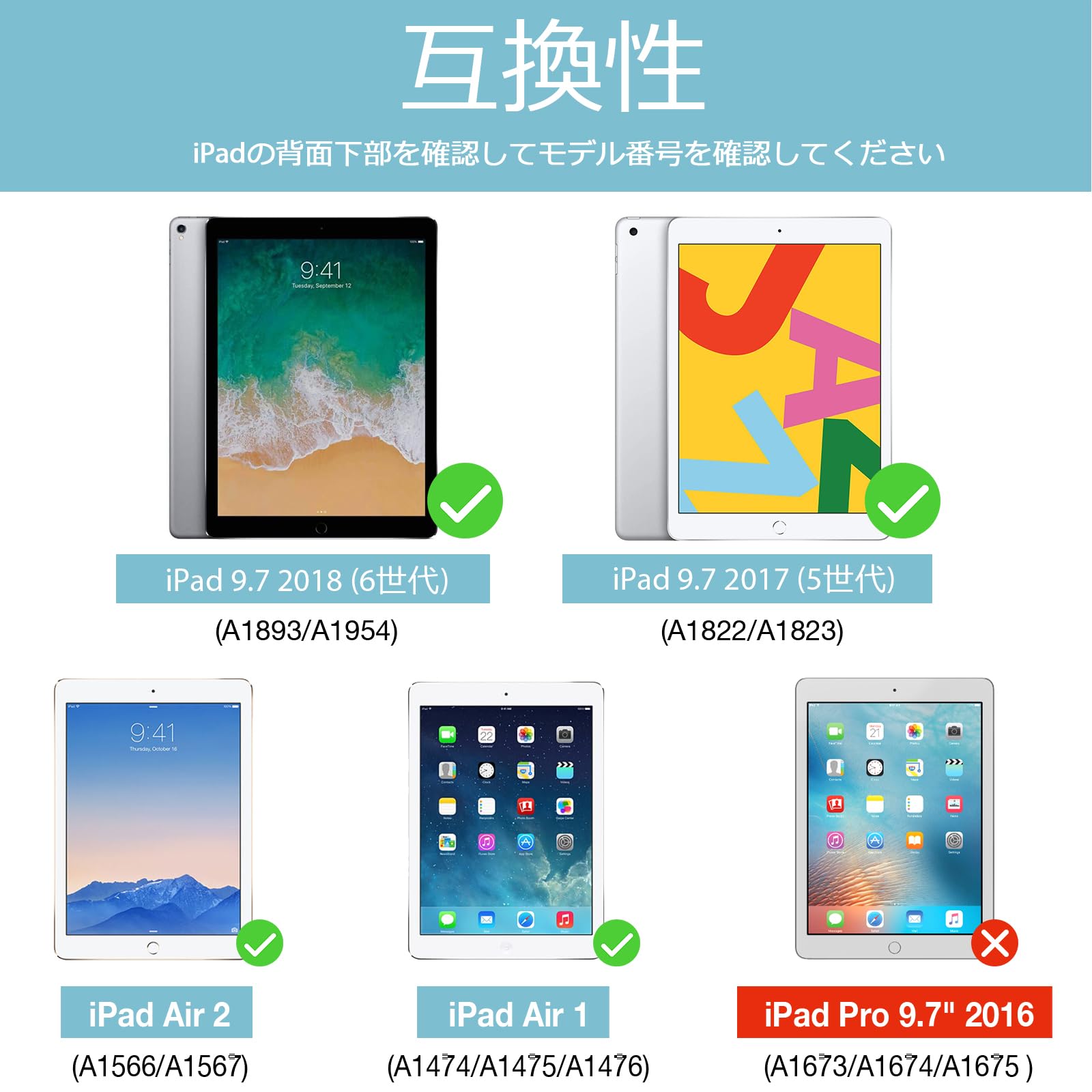 ? 対応機種:iPad 9.7”6世代 2018 (モデル番: A1893 A1954) / 5世代 2017(モデル番: A1822 A1823), iPad Air (モデル番: A1474 A1475 A1476), iPad Air 2 (モデル番: A1566 A1567); その他の型式に適用されません。購入前、ご設備のモデル番号をご確認いただきます。