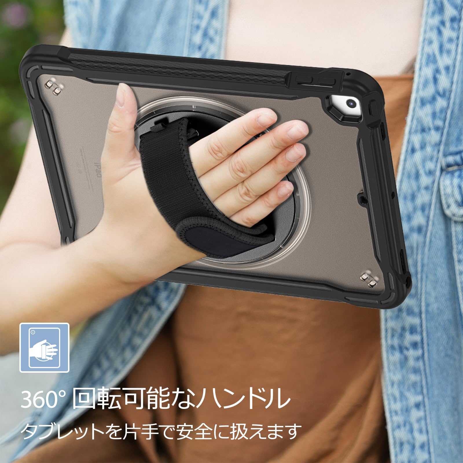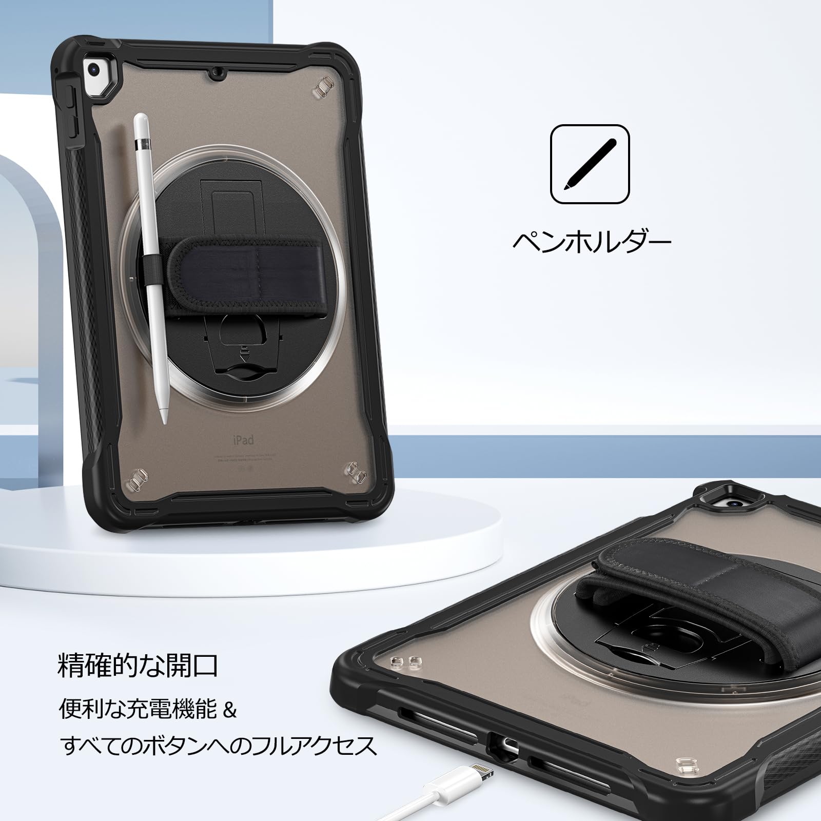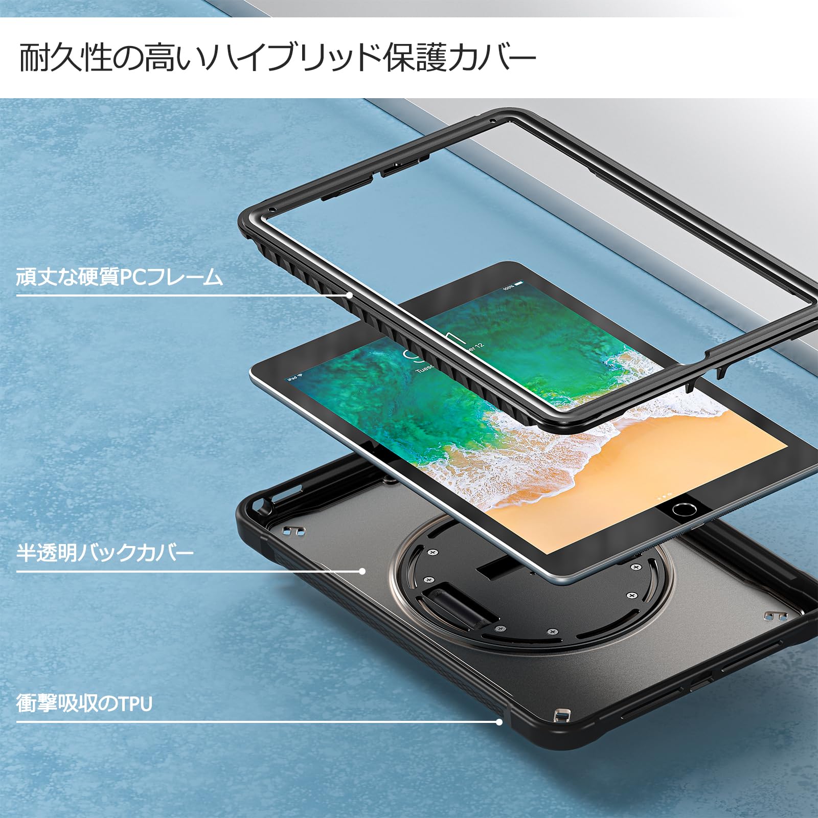 【新着商品】ProCase iPad 9.7 半透明カバー 6世代・5世代 Air 2 Air 1適用 耐衝撃 肩ひも付き ペン収納 360°回転スタンド 手首付き 3層保護