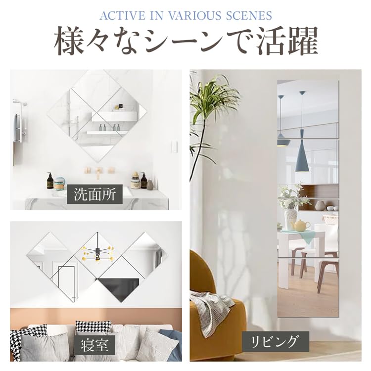 【多様な使い方でお悩み解決】サイズ 縦30cm×横30cm×厚さ0.2cm の4枚セット、5枚セット、10枚セットからお選びいただけます。縦に並べれば全身鏡になり、ひし形でおしゃれなインテリアとして早変わり♪壁掛け鏡や置き鏡と違い場所のスペースが必要ないため、お部屋がスッキリ♪