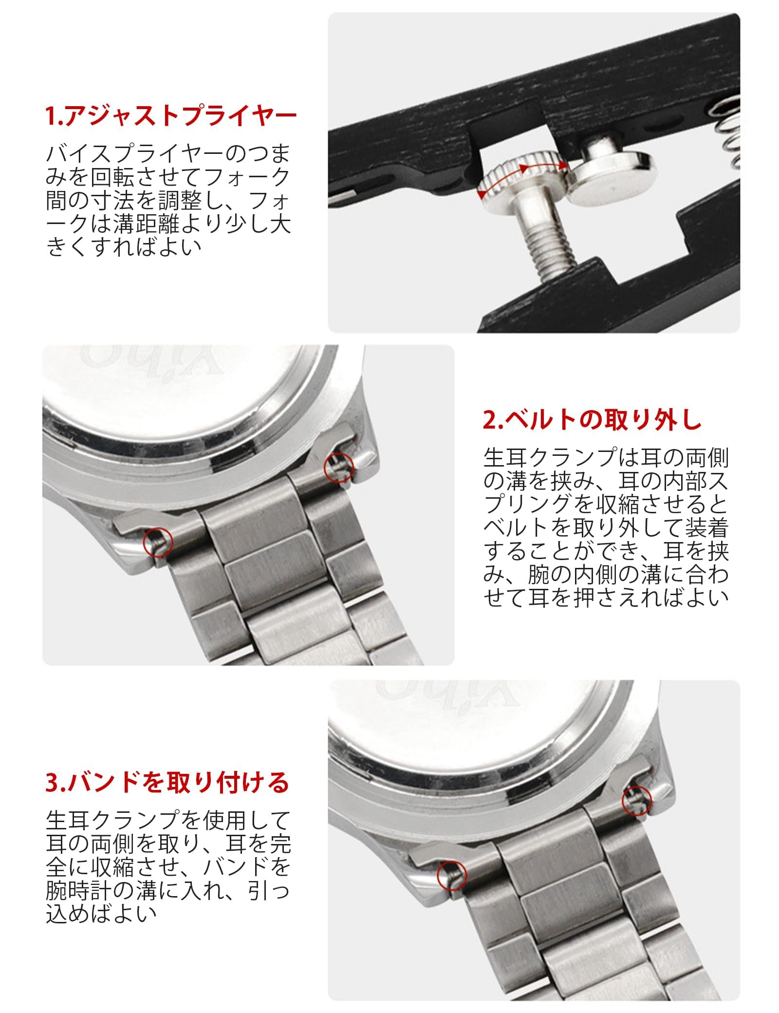 【使用範囲が広い】ツールには5セットのユニバーサル交換可能ピンフォークが含まれ。ピンフォークのサイズはさまざまなラグに適しており、いくつかの狭いスロットも操作できます。角度はペンチで調整でき、さまざまなスプリングラグの使用に適しています。あらゆるサイズの時計に適しています。
