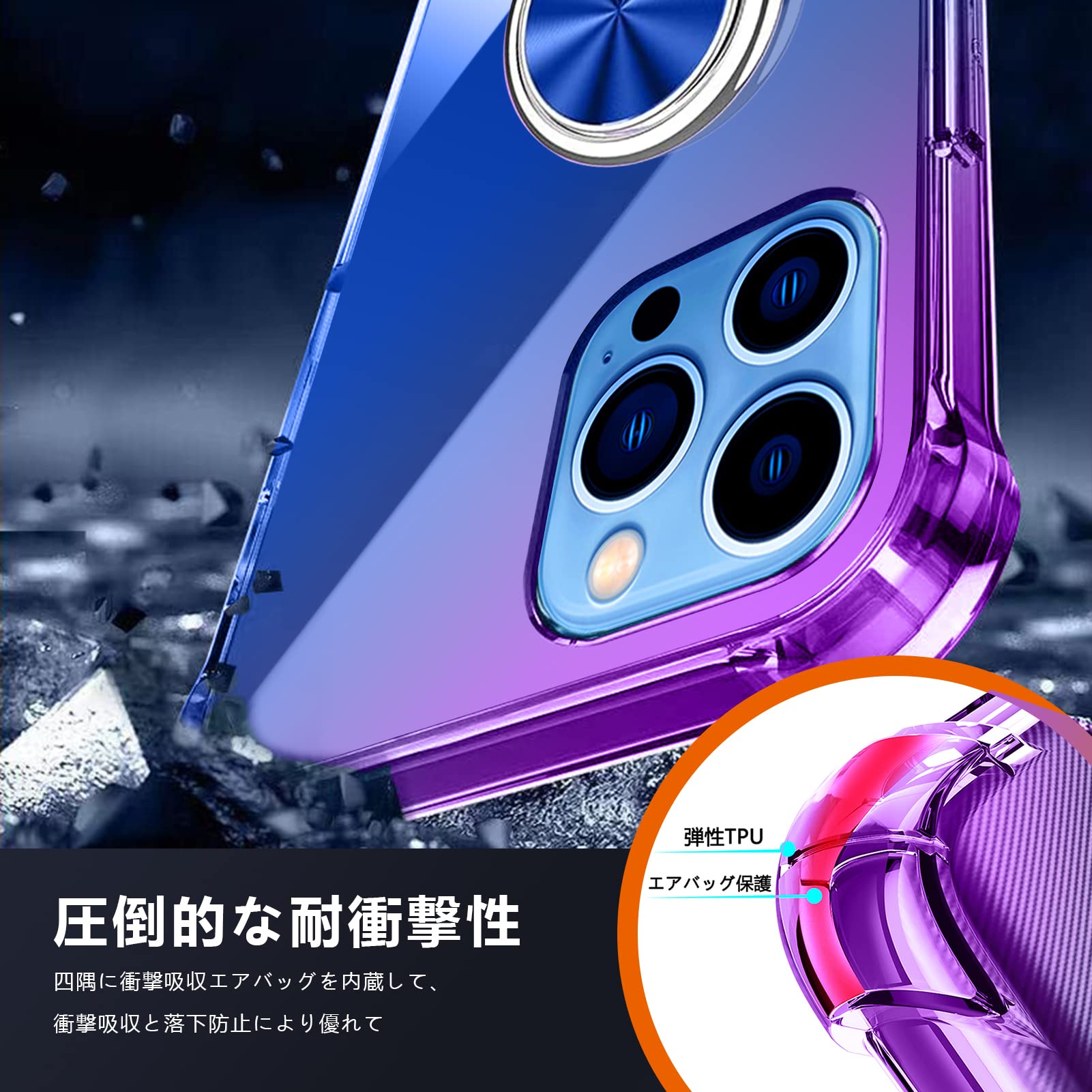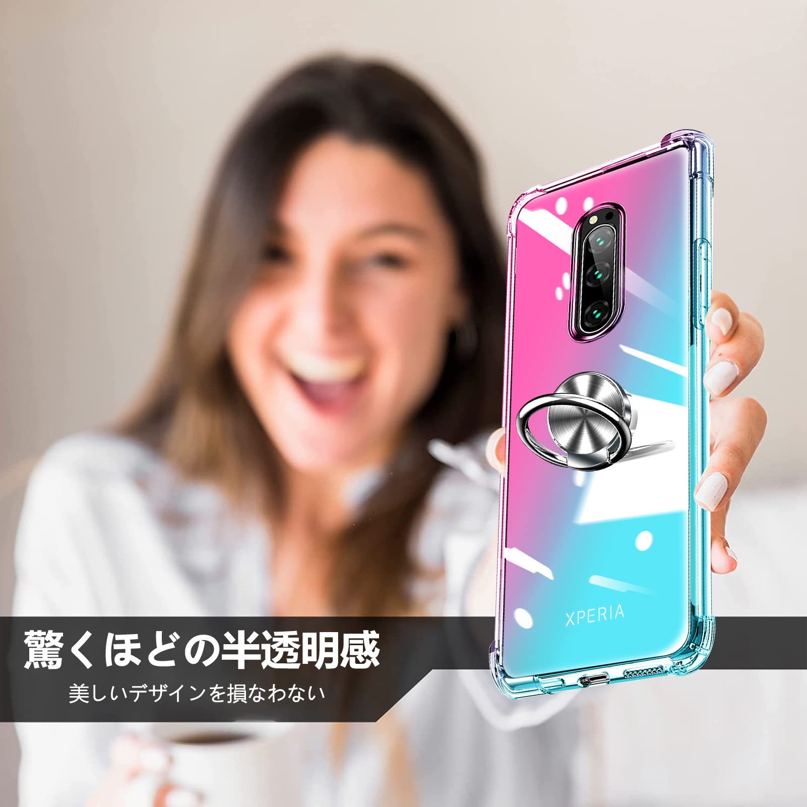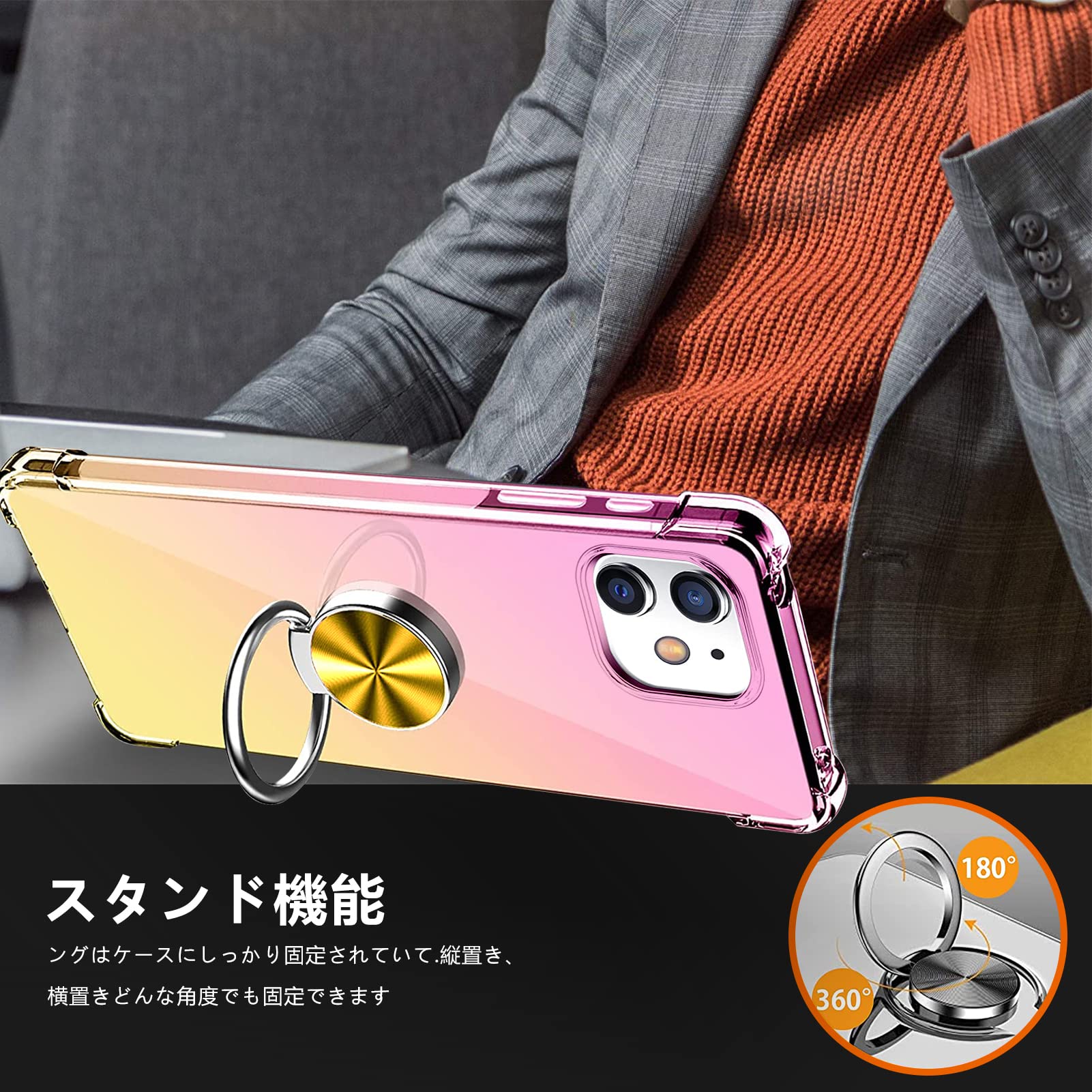 【魅力なグラデーション色&スタンド機能】透明な背面は本体の美しさを示し、グラデーションの色は、よりスタイリッシュに感じられます。リング.ホルダーの機能は携帯を横に放置できて、いつでもどこでも音楽、facetime、映画などの娯楽番組を思い切り楽しめます。