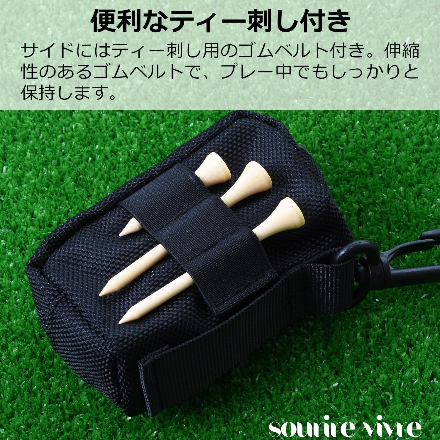 ?サイドにはティー刺し用のベルトも付いているのでティーの収納も可能。※ゴルフボール・ティー・フォーク・マーカーは当商品に付属しません。