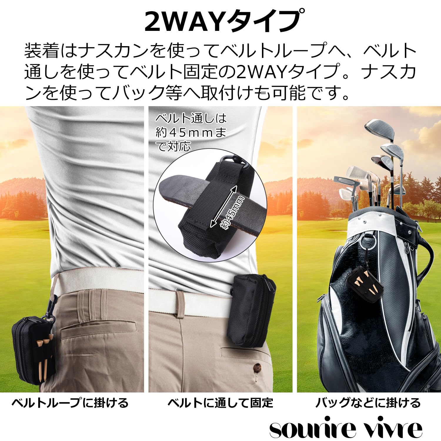 [sourire vivre] ゴルフボールケース 2個入れ用 フォークやマーカーも入るゆとりある容量 ティ刺し付 ゴルフ ボールポーチ シンプル ブラック