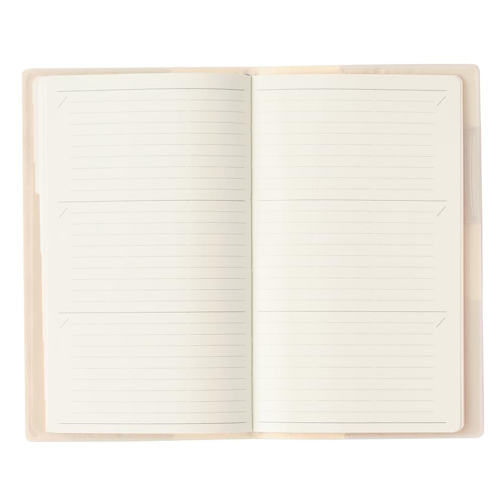 【週間ページ】見開き2週間で日付が縦に並ぶ罫ページタイプのレイアウト。記入スペースが5分割されているので、家族の予定など項目ごとに見やすく整理して記入できるのが特長です。