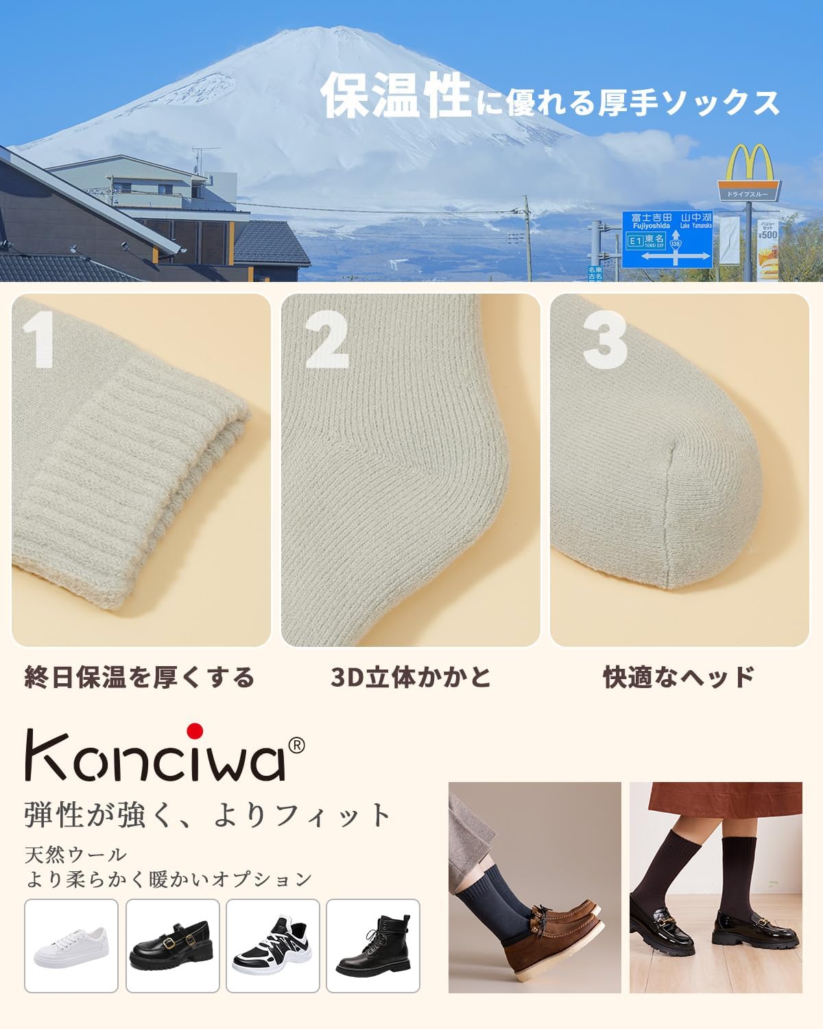 [konciwa] 靴下 メンズ 冬 厚手【極暖38℃恒温・極厚裏パイル・ウール素材・360°蓄熱】 ソックス ウールソックス 防寒 保温 消臭 耐久性 伸縮性 室内 アウトドア 登山 キャンプ 24-28㎝ 3足-5足セット