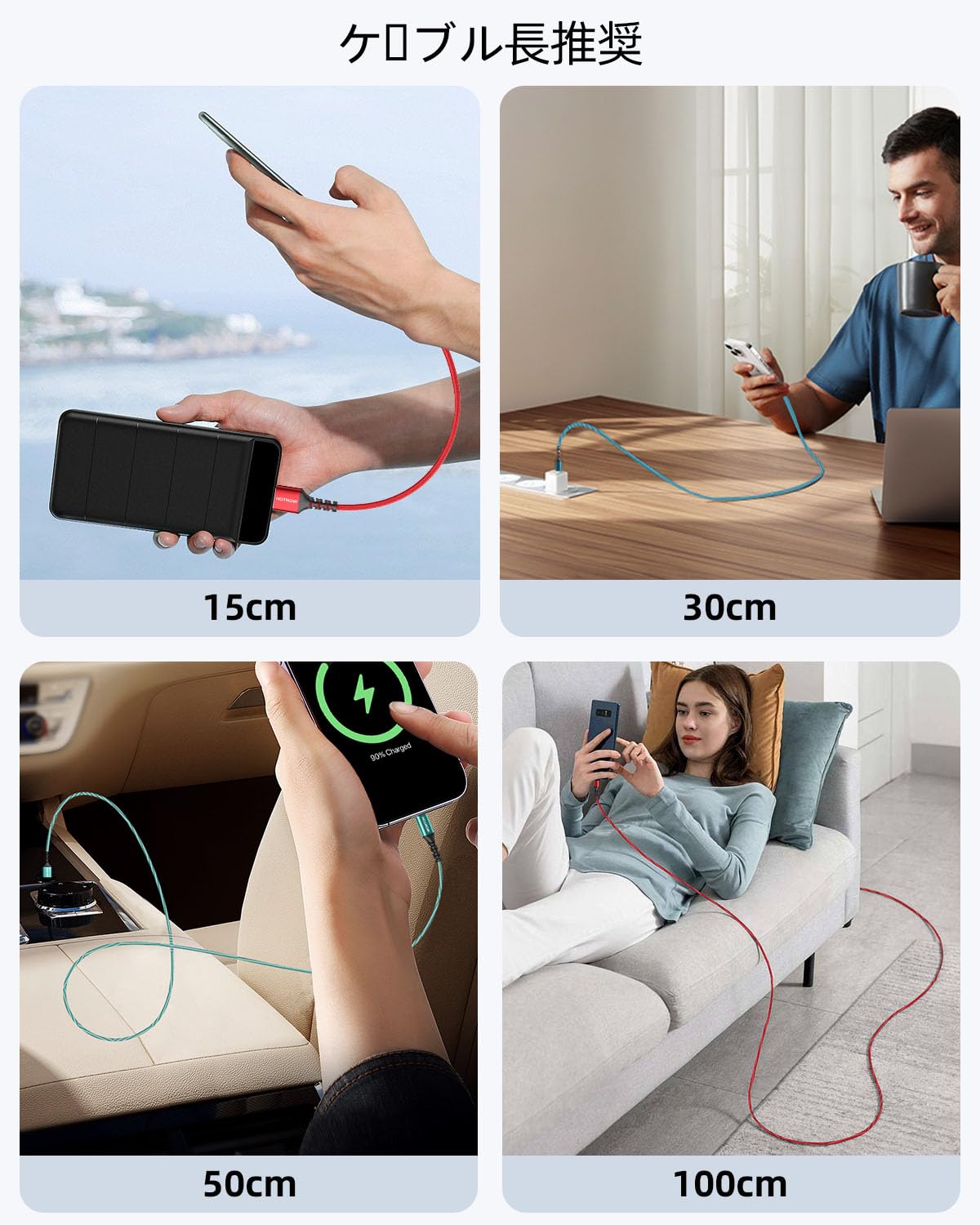 短設計のケーブルは、短距離充電に最適で、絡み合いがなく、持ち運びに便利です。