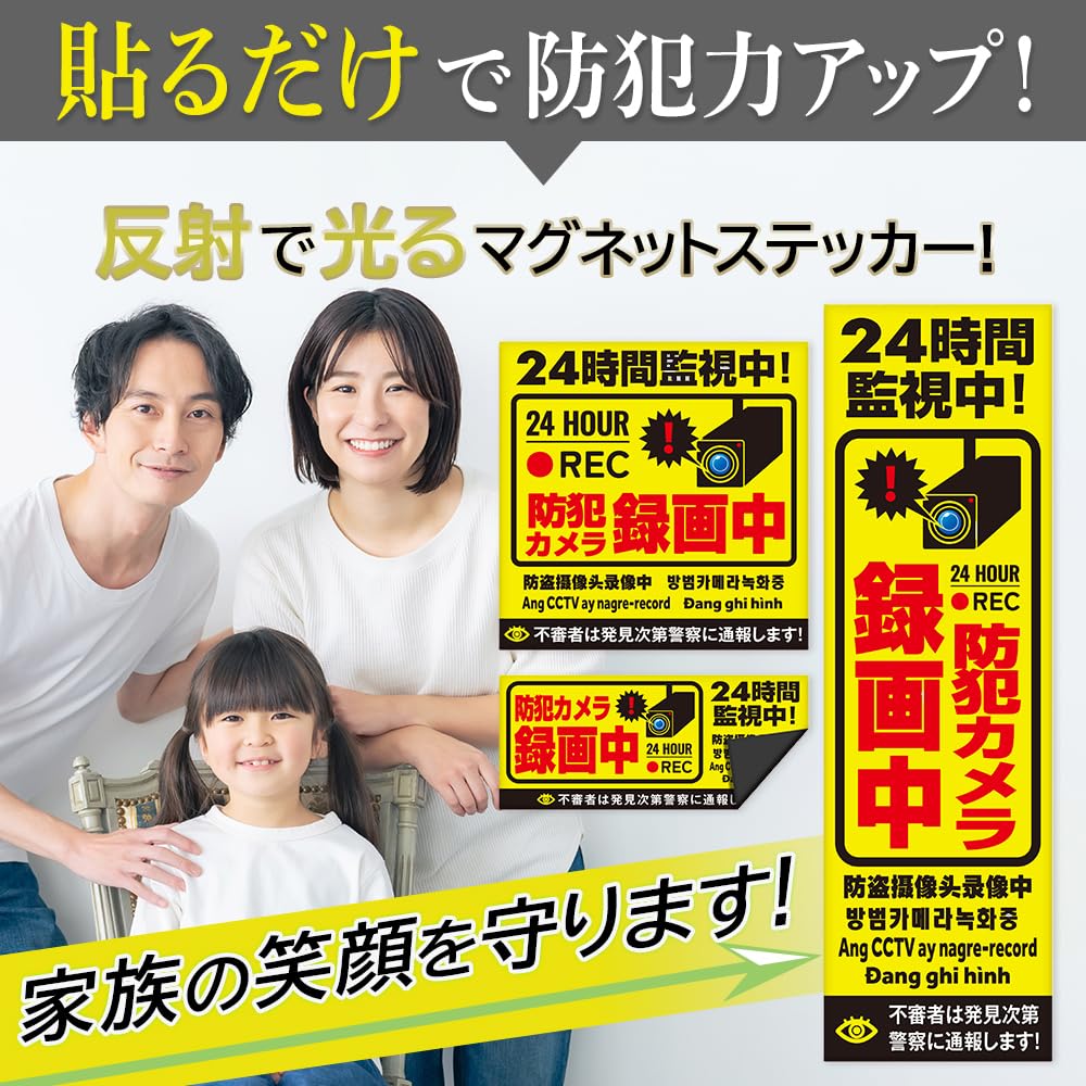 防犯カメラ マグネット 作動中 [耐光/耐水/耐候/反射] 防犯 シール 屋外【6カ国語に対応】 (正方形 12.5㎝×12.5㎝)