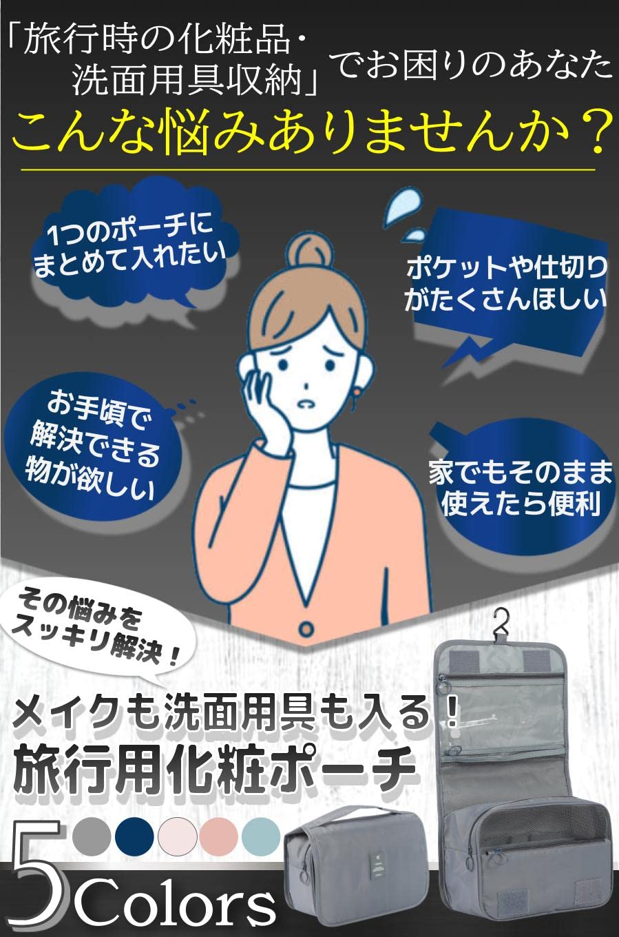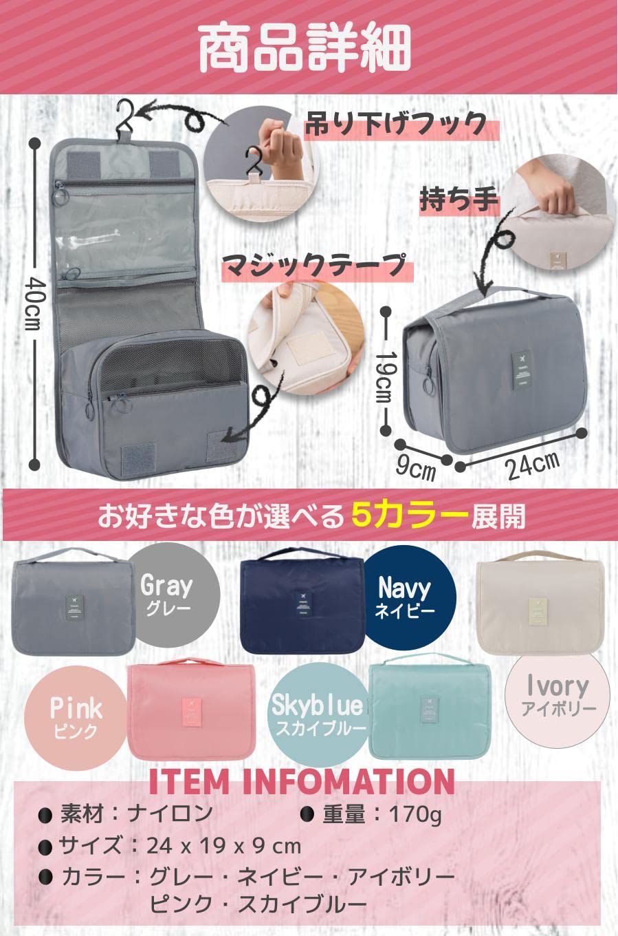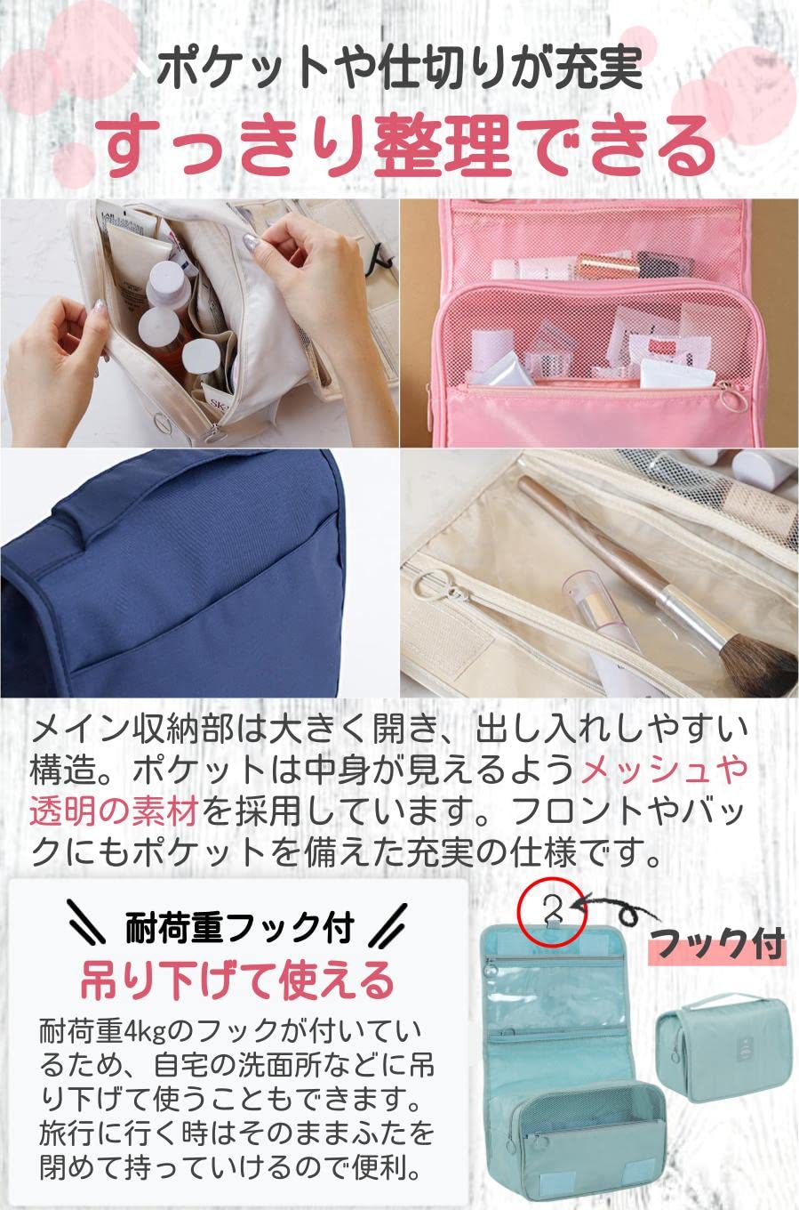 【商品特徴】 大容量で旅行に便利:メイク用品と洗面道具をたくさん収納できる ボトルが倒れない:ボトルを固定できるゴム付きで安心 中身がよく見える:メッシュや透明ポケットで外からも良く見える 吊り下げられる:フックがついているから吊り下げて使える【商品詳細】 素材:ナイロン 重量:170g サイズ:24 x 19 x 9 cm カラー:グレー・ネイビー・アイボリー・ピンク・スカイブルー