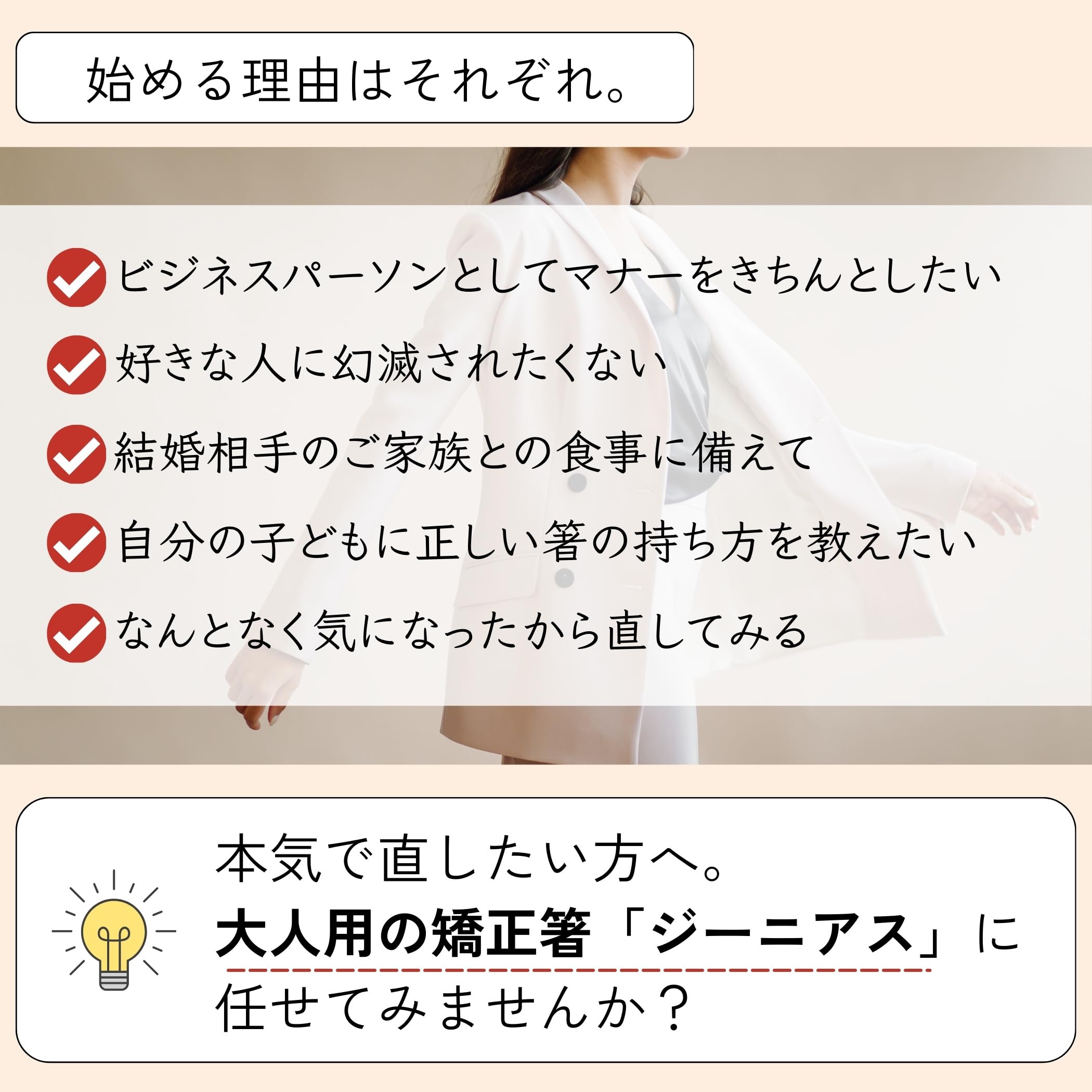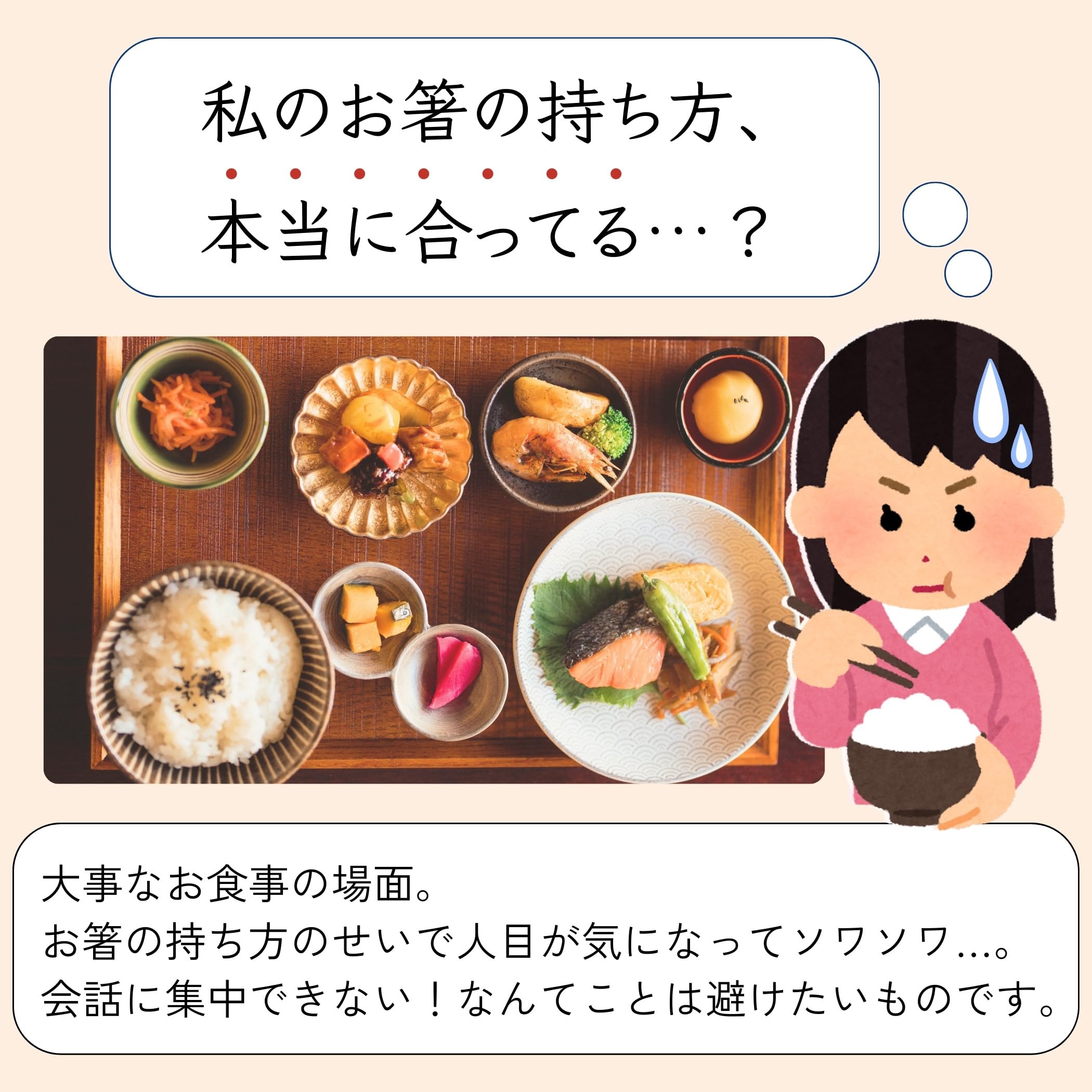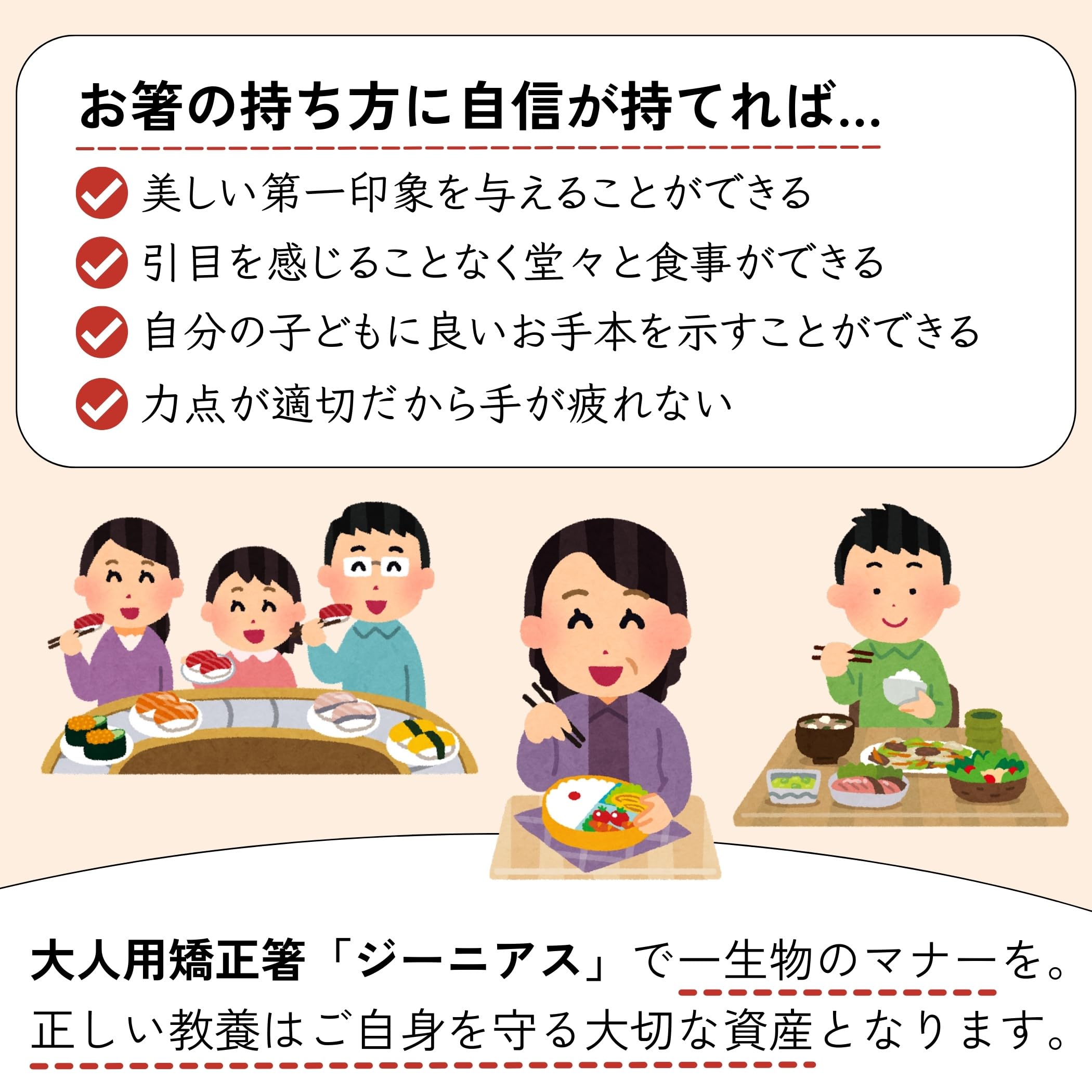 『大人の箸マナーをサポート』 食事マナーの指導にも用いられる設計で、指を正しい位置に導きます。マナーを見直したい大人の女性に最適。