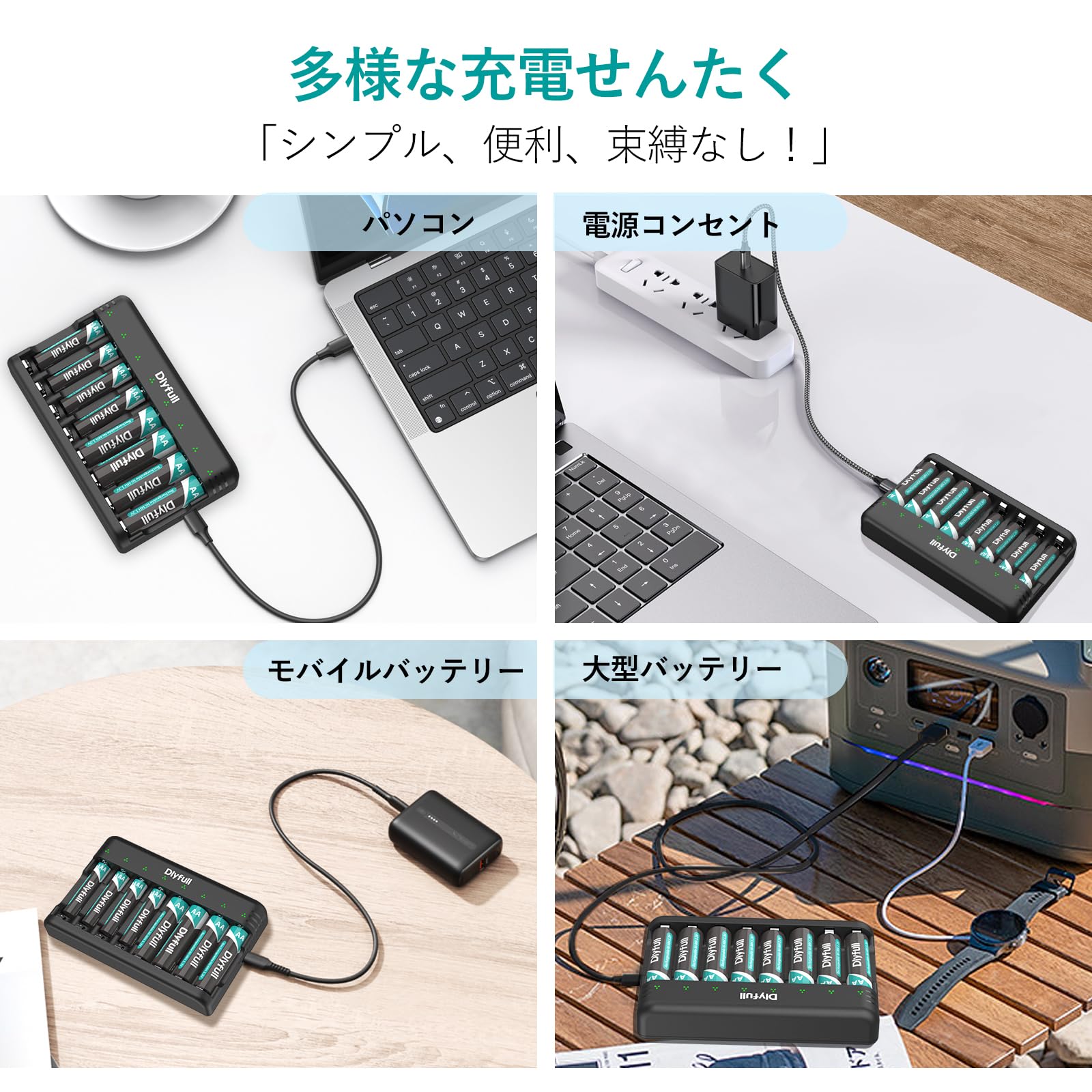 ??【互換性】:1.2V Ni-MH/Cd: 単三(AA)/単四(AAA)など、さまざまなタイプの充電池に対応しています。