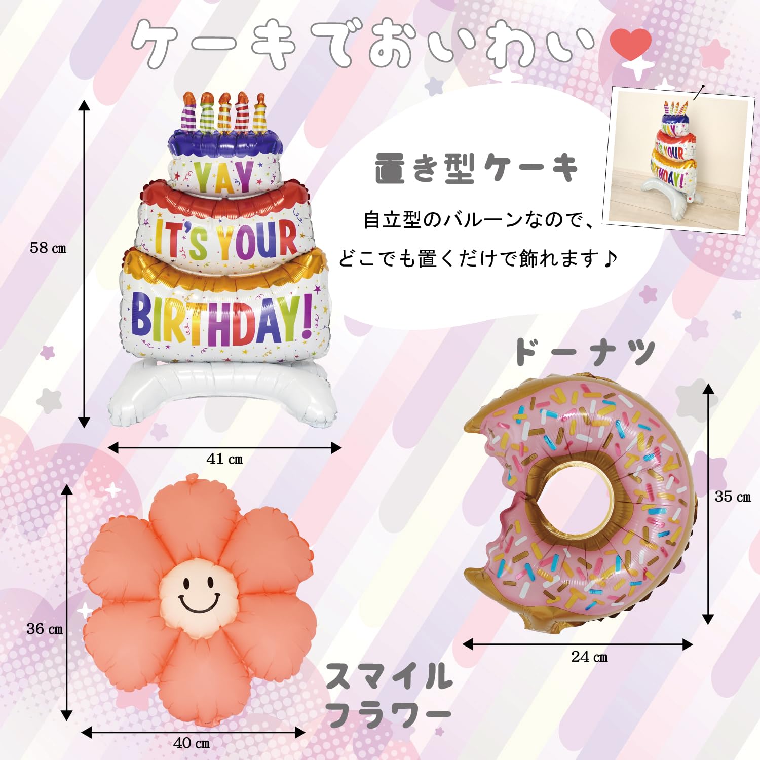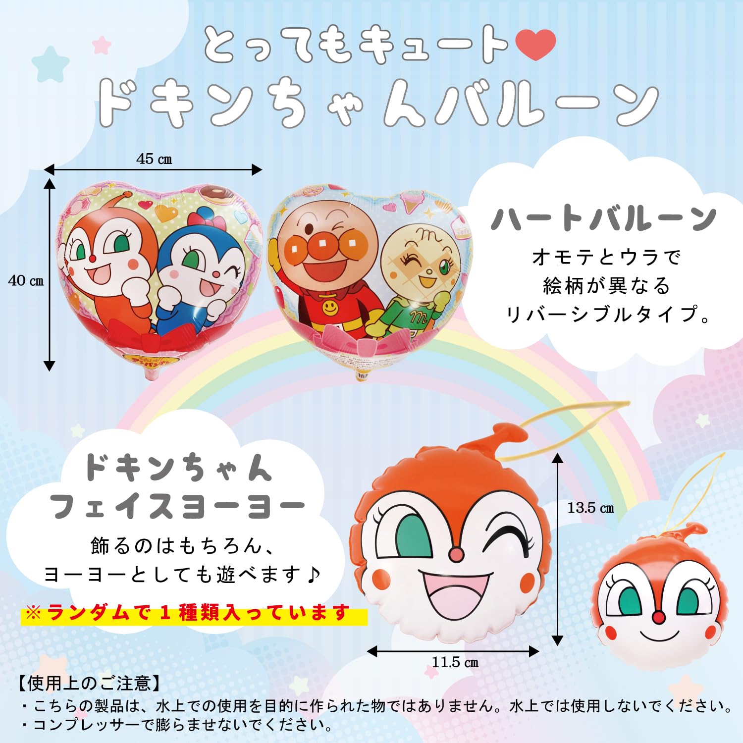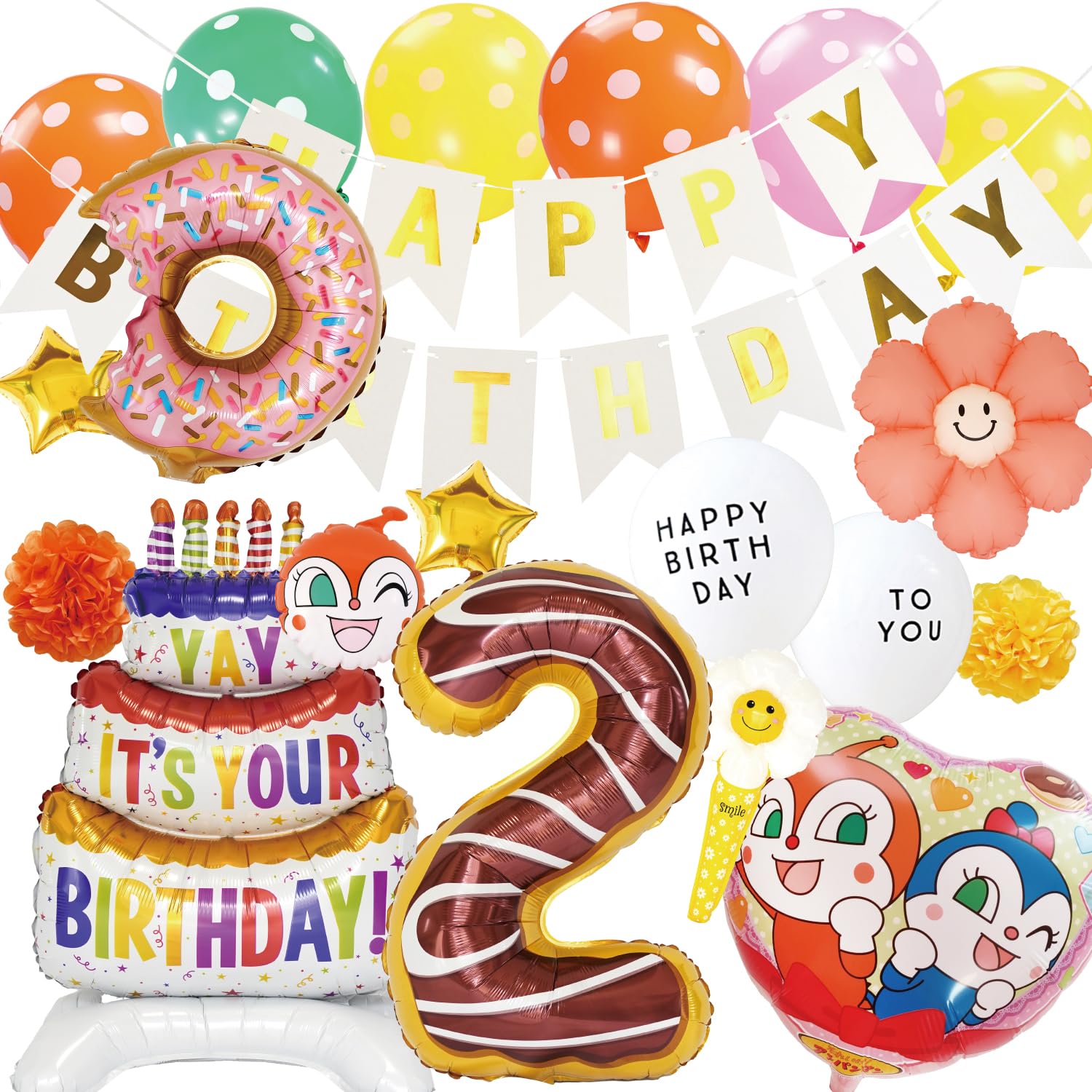 【セット内容】ドキンちゃん ハートバルーン×1、ドキンちゃん フェイスヨーヨー×1、HAPPY BIRTHDAYガーランド(ホワイト)×1、置き型ケーキバルーン×1、ドーナツバルーン×1、スマイルフラワーバルーン(ピンク)×1、スターバルーン(ゴールド)×2、数字バルーン75cm(スイーツ)×1、手持ち用フラワーバルーン(イエロー)×1、HAPPY BIRTHDAYホワイトバルーン×1、TO YOUホワイトバルーン×1、ドットバルーン×6(イエロー、オレンジ×各2、グリーン、ピンク×各1)、ペーパーフラワー×2(オレンジ、イエロー×各1)、両面シール×1セット ※サイズ等詳細につきましては商品の説明をご覧ください。