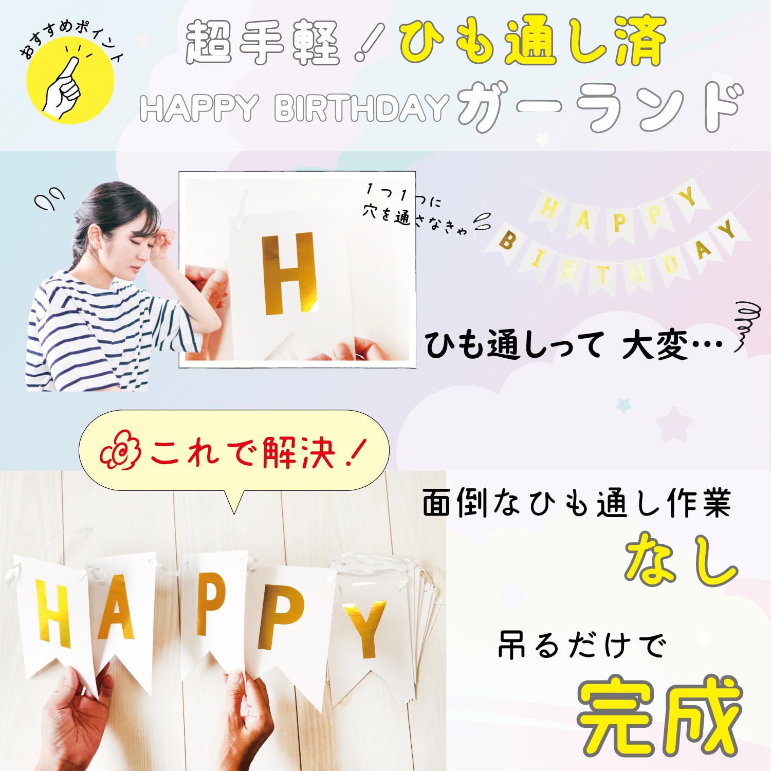 【簡単&便利】ガーランドのヒモ通しが済んだ状態でお届けいたします。子供のバースデーパーティーをおしゃれに、可愛く、簡単に飾りたい。そんな方におすすめのオールインワンセットです。忙しいお母さまでもお手軽に誕生日パーティーの飾り付けができます。※空気が入っていない状態でのお届けとなります。