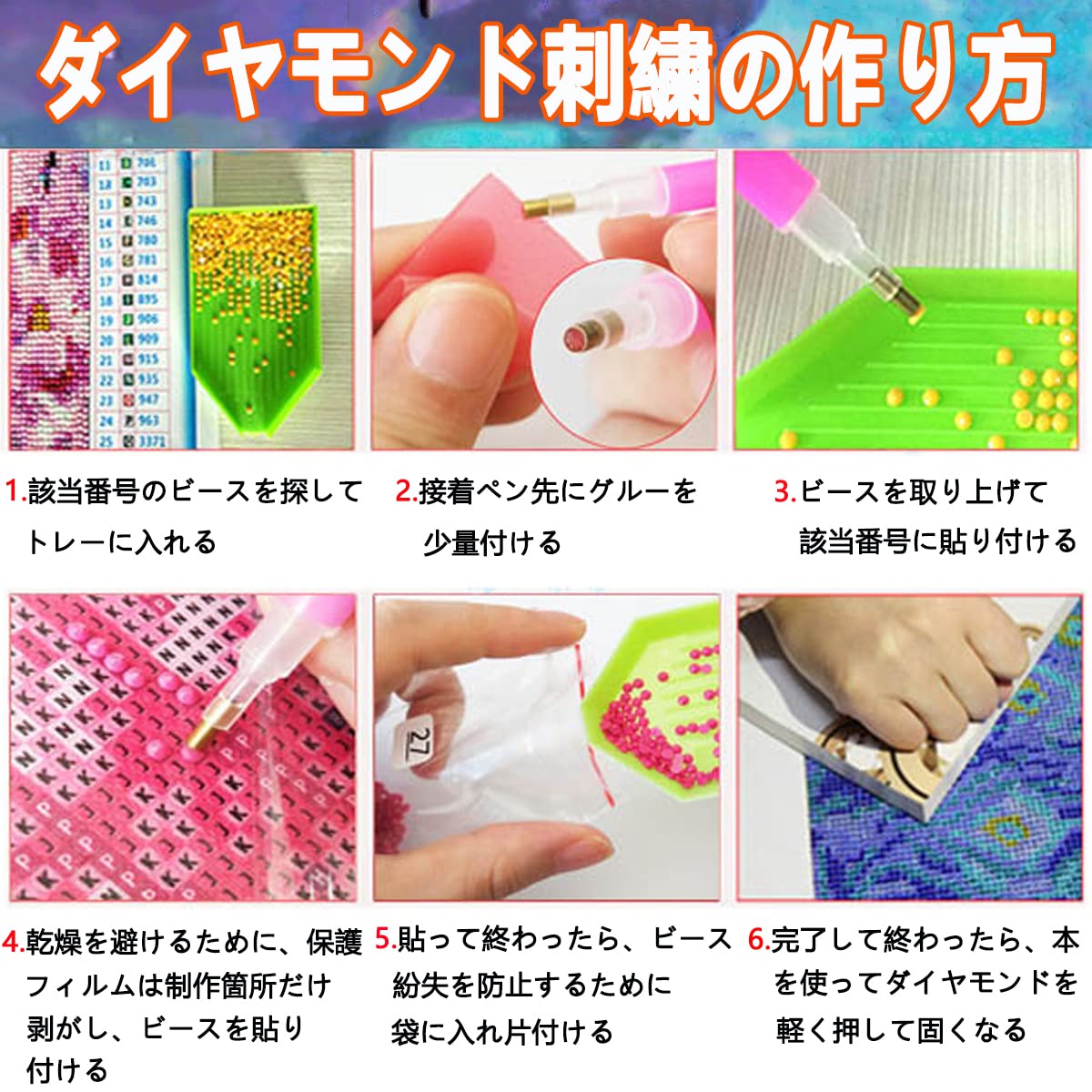 【ダイヤモンド アートの作り方が簡単】--ペン先をピンクのグルーを付けて台紙にビーズと同じ記号または英数字を貼り付けるだけでキラキラなダイヤモンドアートが仕上がります。クロスステッチ刺しゅうより気軽になり、集中力がUP、達成感もじゅうぶん味わっていただけます。(ご注意:6歳以上をお勧めます、子供は大人の世話の下で制作する必要があります。)