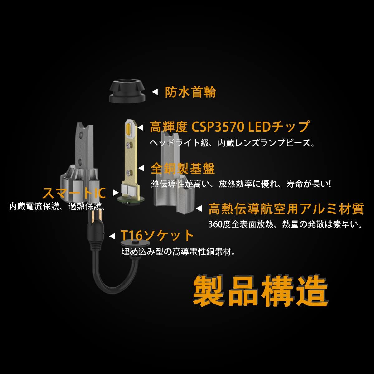 ?ハイパワー&眩しいほど明るいT16/T15 LED ライト:バックランプ専用高品質CSP3570 LEDチップ2個搭載、死角のない360度全方位照射仕様、視界がはっきりになります。ハロゲンランプの輝度より、少なくとも10倍以上に高いです。車改造や明るさに対する高い要求を持っている人にとって適合です。