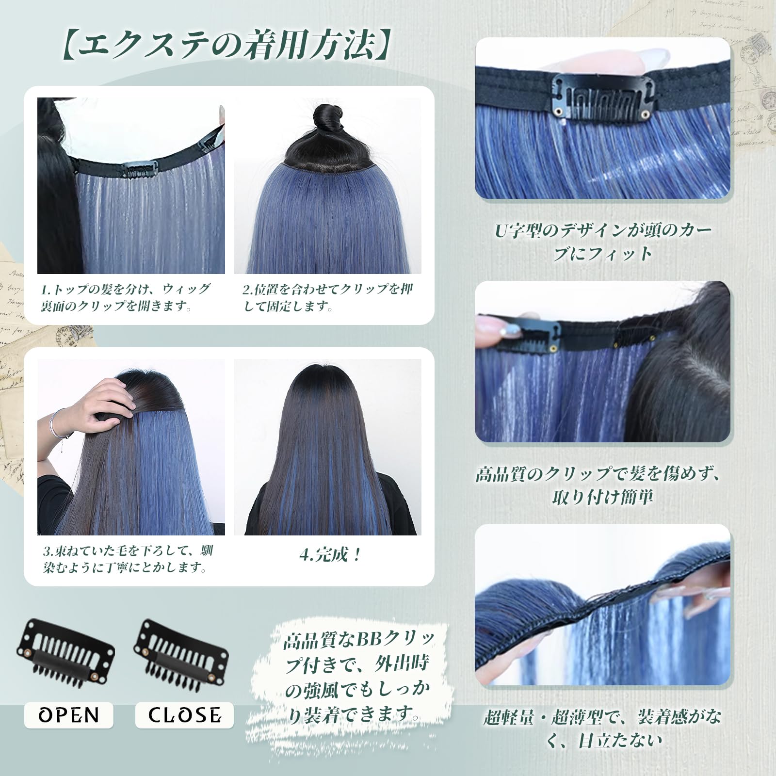 ?【軽量&快適】ウィッグの裏側には、高品質なBBクリップ付きで、簡単に取り付けられるので、ヘアエクステ初心者でも安心して装着できます!髪を傷めず、取り付けも簡単で、強風時の外出でもしっかり固定できます。ウィッグは全体的に非常に軽くて薄いため、装着時に頭皮への負担が少なく、自然で目立ちません。わずか数秒で理想のスタイルにチェンジ。初心者でも安心して使える設計です。医療用としても皆様から愛されています。