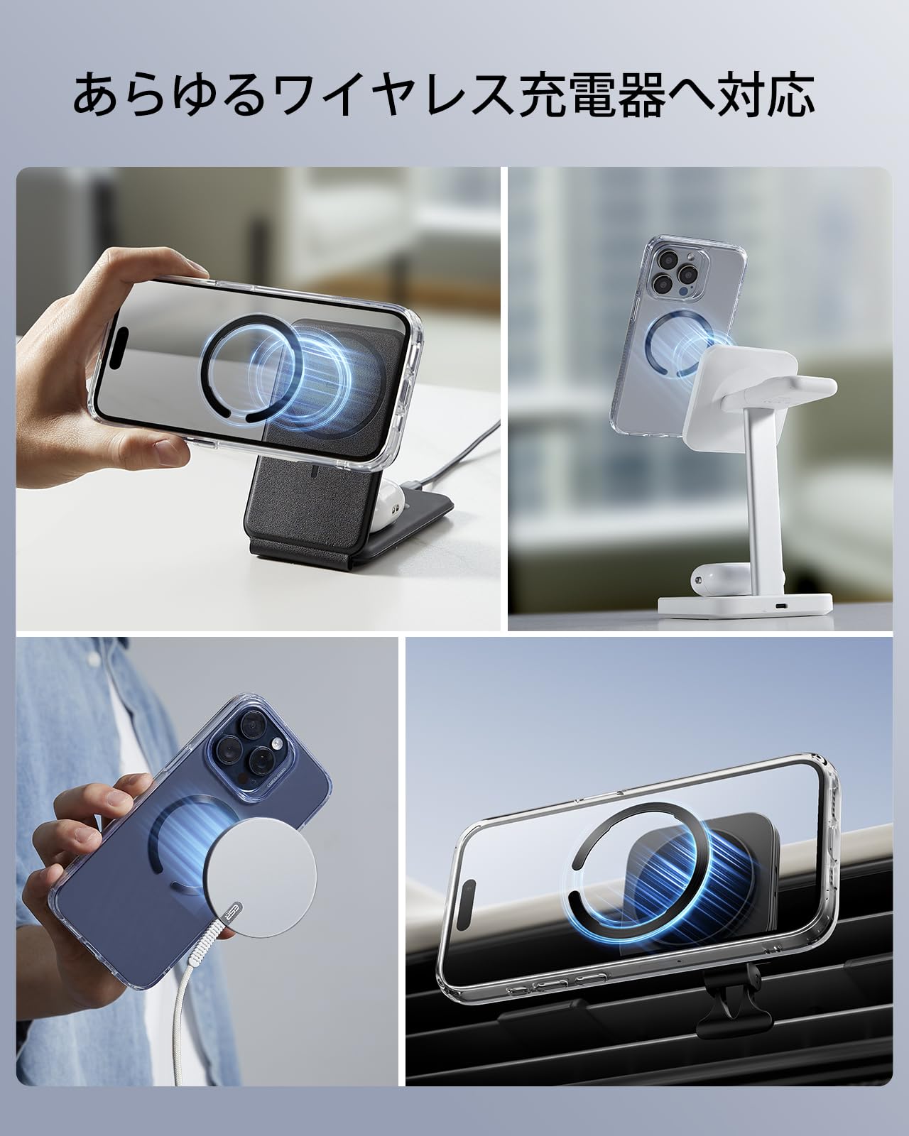 【簡単にワイヤレス充電】MagSafeワイヤレス充電器上で自動的にスマホの位置を調節し、置くだけで簡単にワイヤレス充電でき、位置がずれる心配もありません。