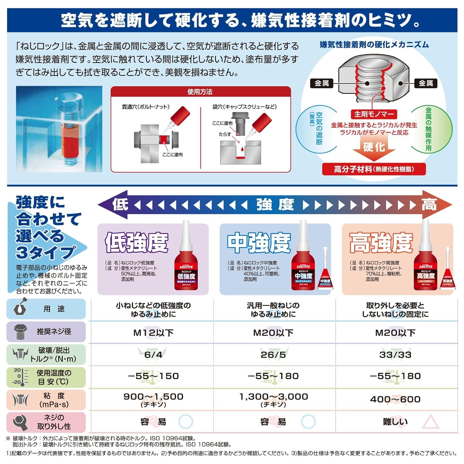 金属接合部で空気の供給を断つことによって硬化し、衝撃、振動によるねじのゆるみを防止します。