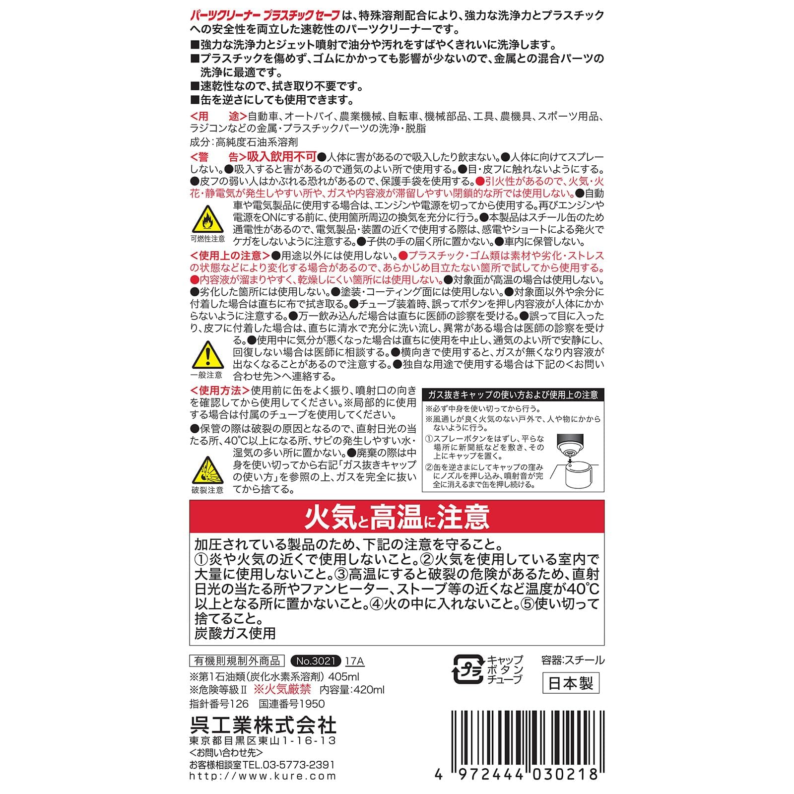 【人気商品】KURE(呉工業) パーツクリーナー プラスチックセーフ 420ml パーツクリーナー 3021