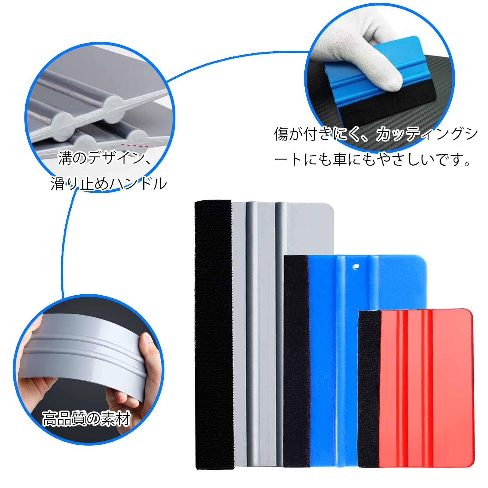 【高品質素材】軽く、耐熱性・衝撃強度に優れたプラスチックは硬すぎず、柔らかすぎず、柔軟性があります。先端部分は素材にやさしくキズが付かないフェルト(取り外可能)を付けています。傷が付きにく、カッティングシートにも車にもやさしいです。