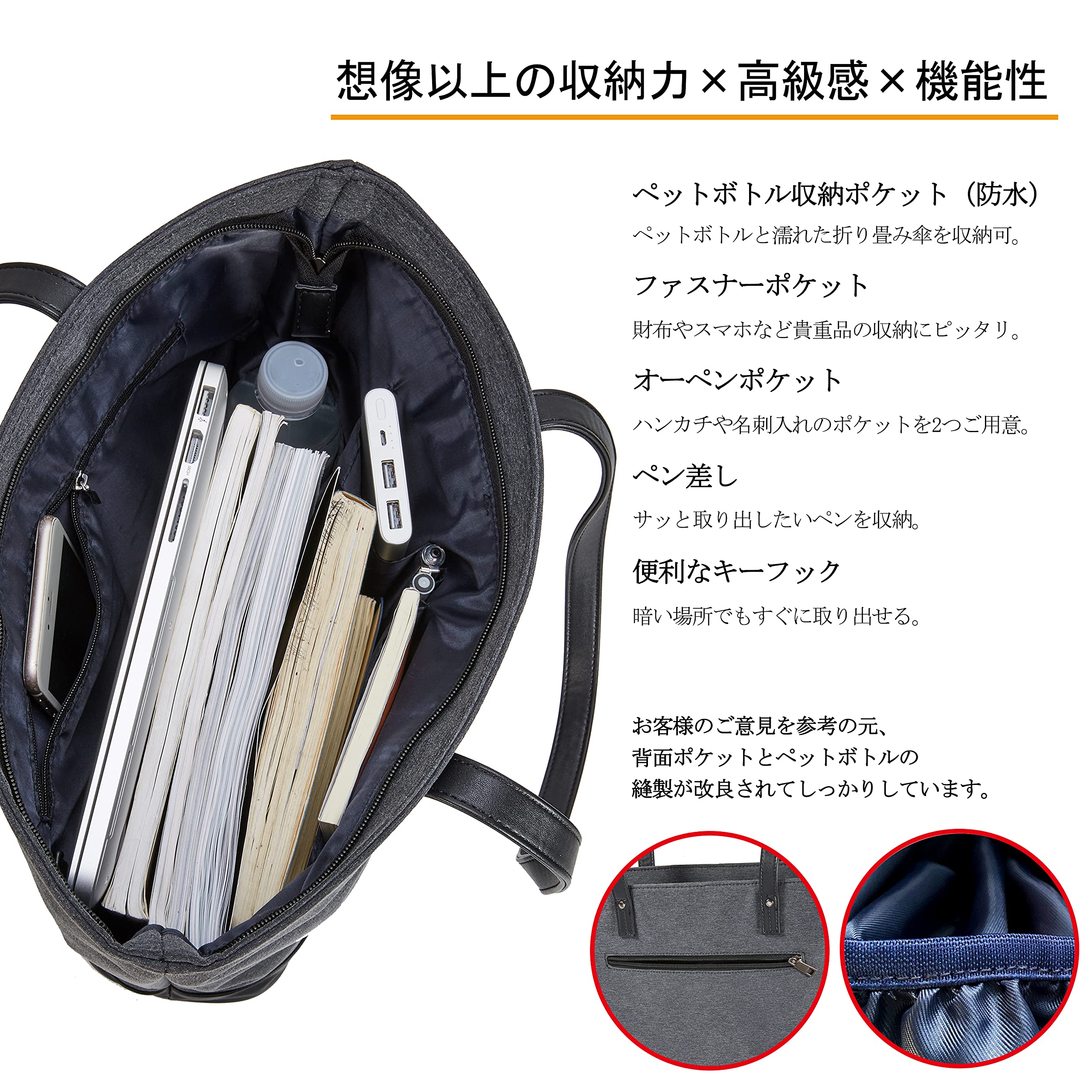 [たっぷり収める収納力で仕事をサポート]A4ファイルやノートPCが楽に収納できる、余裕のキャパシティ。マチのあるので、上着やお弁当など、かさばるものもすっきり収納します。中にはオーペンポケット2つとペン差し2つ、ファスナーポケット1つを用意し、携帯やハンカチなどの細かいものも整理がしやすい設計に。口が大きく開くファスナーで、中の荷物の出し入れもスムーズにできます。