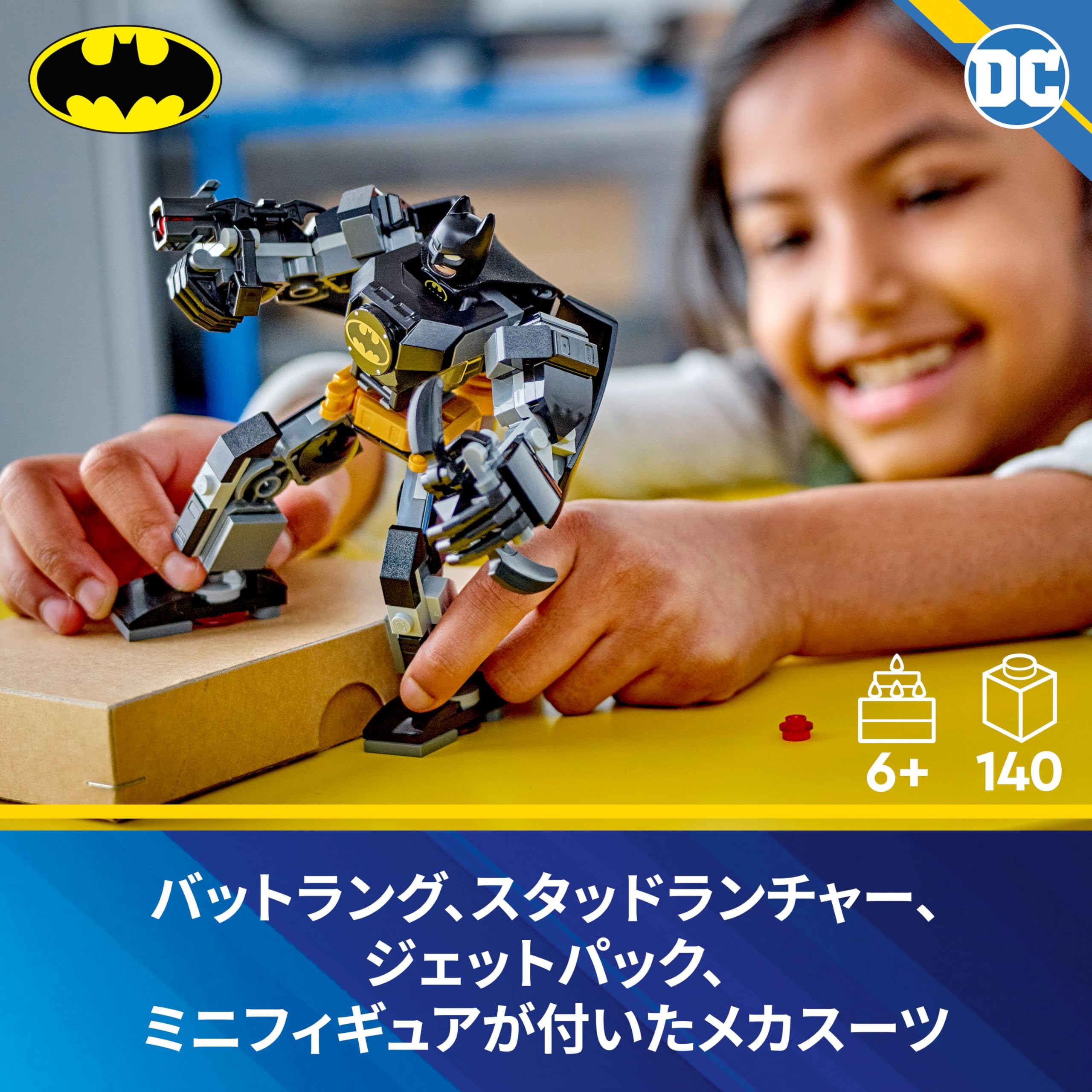 コレクターズアイテム ? バットラング、スタッドランチャー、ジェットパックで武装したバットマン メカスーツに布製マントを着けたバットマンのミニフィギュアが付属しています。ミニフィギュアのバットラングは、メカの腕に取り付けられます