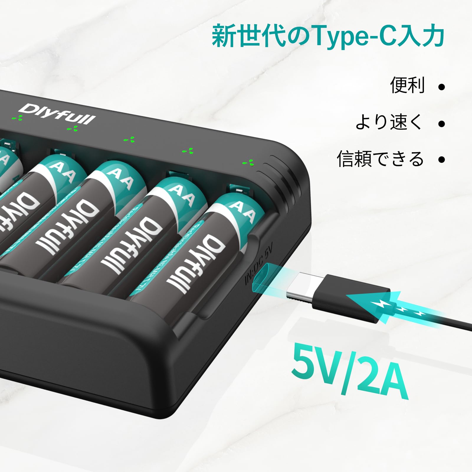 Dlyfull 電池充電器 単4 単3 充電池 充電器、USB Type-C入力 8スロット単三 単4 充電器/充電式ニッケル水素電池 充電器/ニカド充電池に対応 同時充電 LEDライト 単3 バッテリー 充電器 エネループ 充電器 単3 充電池充電器 (黒色)
