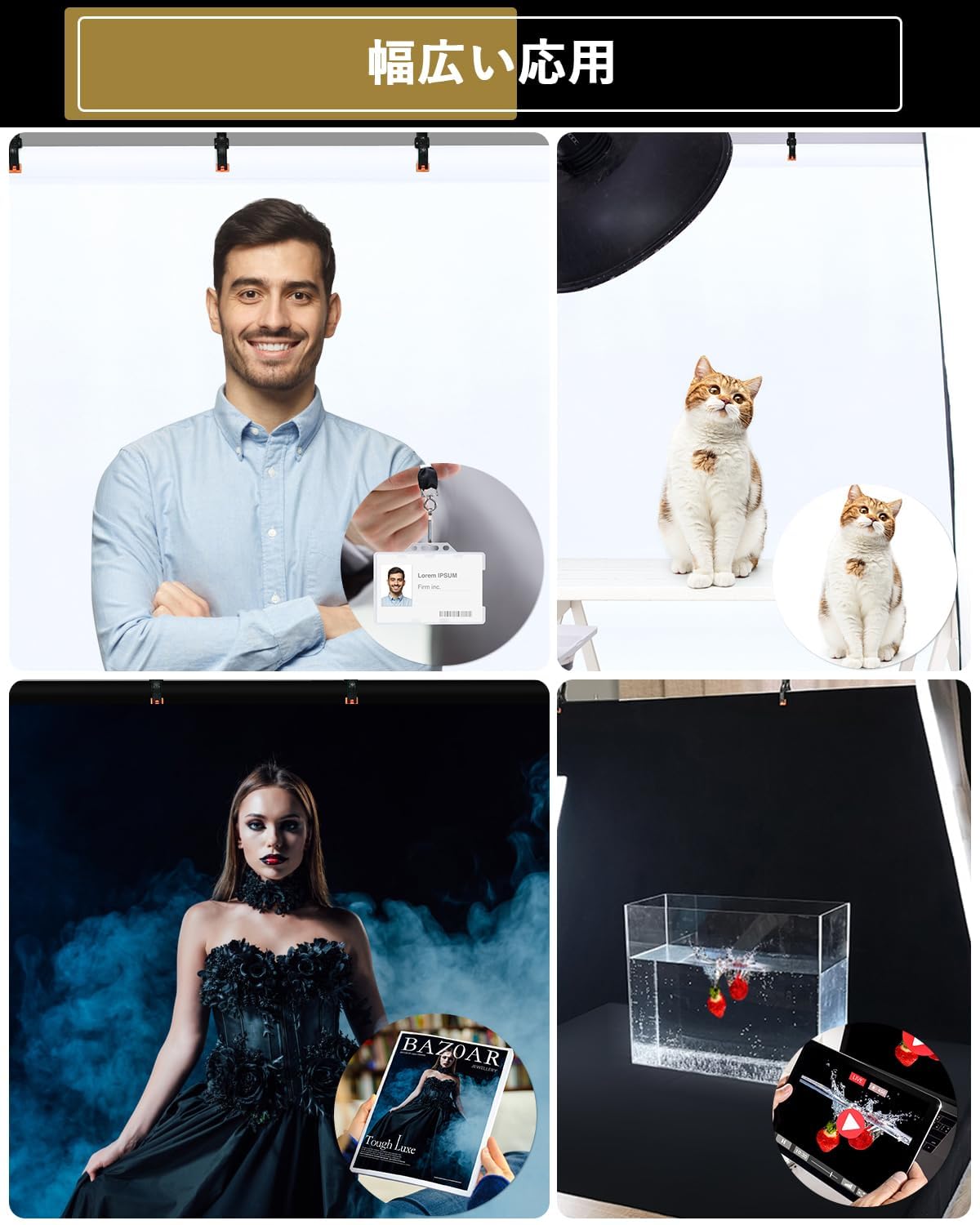 【リバーシブル背景】白黒両面とも使えて、色々なシーンや商品やスタイルに合わせます。人物、家具、服飾品、雑貨、小物など、あらゆる撮影がこの1枚背景シートでOKです。2色でキー抜きでき、スチル撮影には役立ちます。スタジオ、フォトスタジオ、クラブ、オフィスなどで使用でき、撮影シーンを簡単に設定できます。Web会議、テレワーク、リモート、ライブ、コスプレイヤーの背景などに適しています。簡単に処理でき、綺麗な背景をすばやく作成できます。