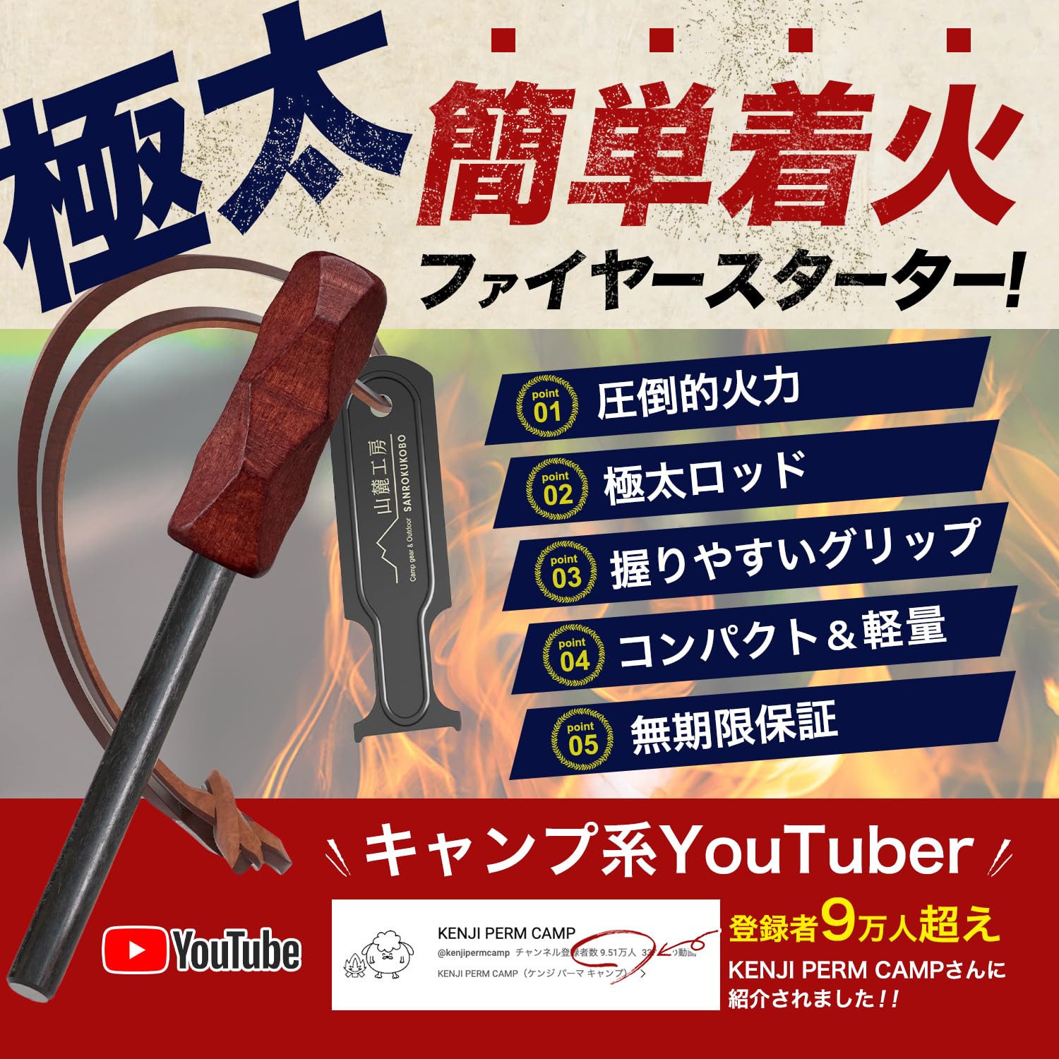 ?【人気Youtuberに紹介されました】チャンネル登録者数 8.8万人の人気Youtuber「KENJI PERM CAMP」さんに紹介されました!?【圧倒的火力】持ち手とロッド部分が大きく、しっかり擦ることができるので大量の火花を出すことができます。