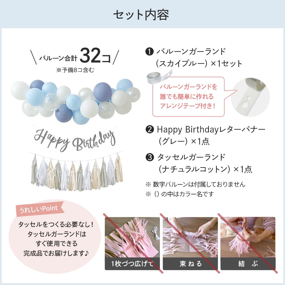 【セット内容】バルーンガーランド×1セット(風船32個分うち予備8枚+アレンジテープ)、Happy Birthdayレターバナー×1つ、タッセルガーランド×1つ(完成品でお届けします)