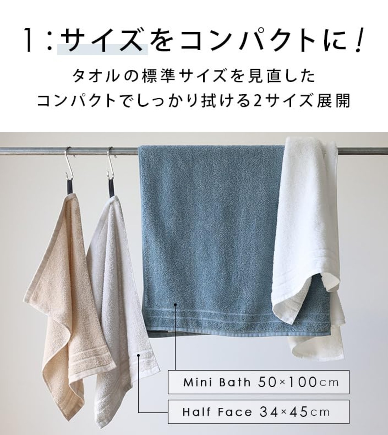 【フェイスタオルの長さを通常の半分に!】約34×45cmの半分サイズでも水分を心地よく吸水。使い分け・交換も気軽にできて、清潔に使える絶妙サイズです。キッチンでの手拭きにも使いやすく、カバンに収まりやすいサイズのため外出時もおすすめです。