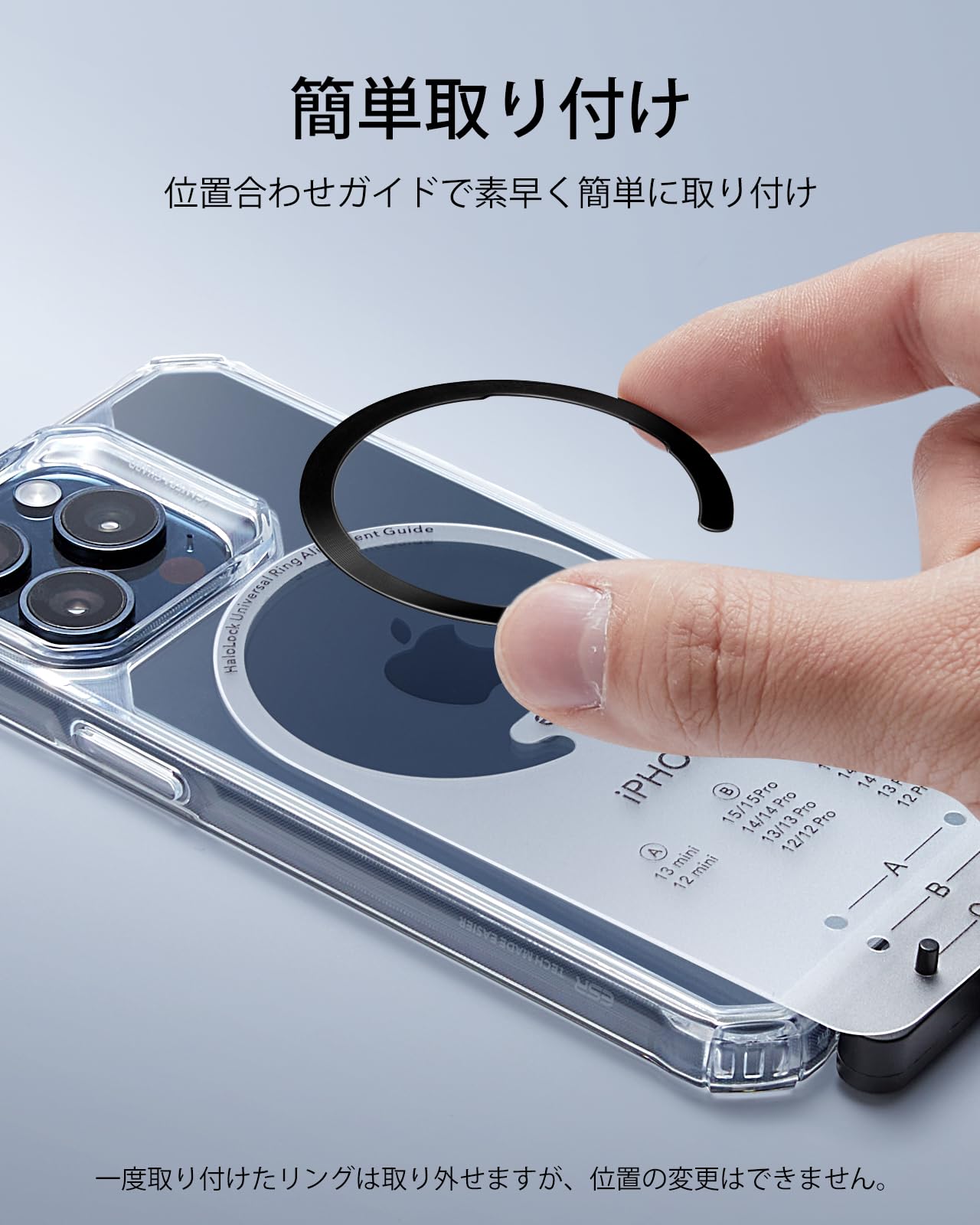 【貼り付け簡単】直感的に分かる位置調節ガイドにより対応機種の正しい位置に簡単にリングを貼ることができます。magsafe リングは一度貼り付けると、取り外すことはできますが、貼り直すことはできません。??取付けツールには位置合わせ用クリップが付属しています。