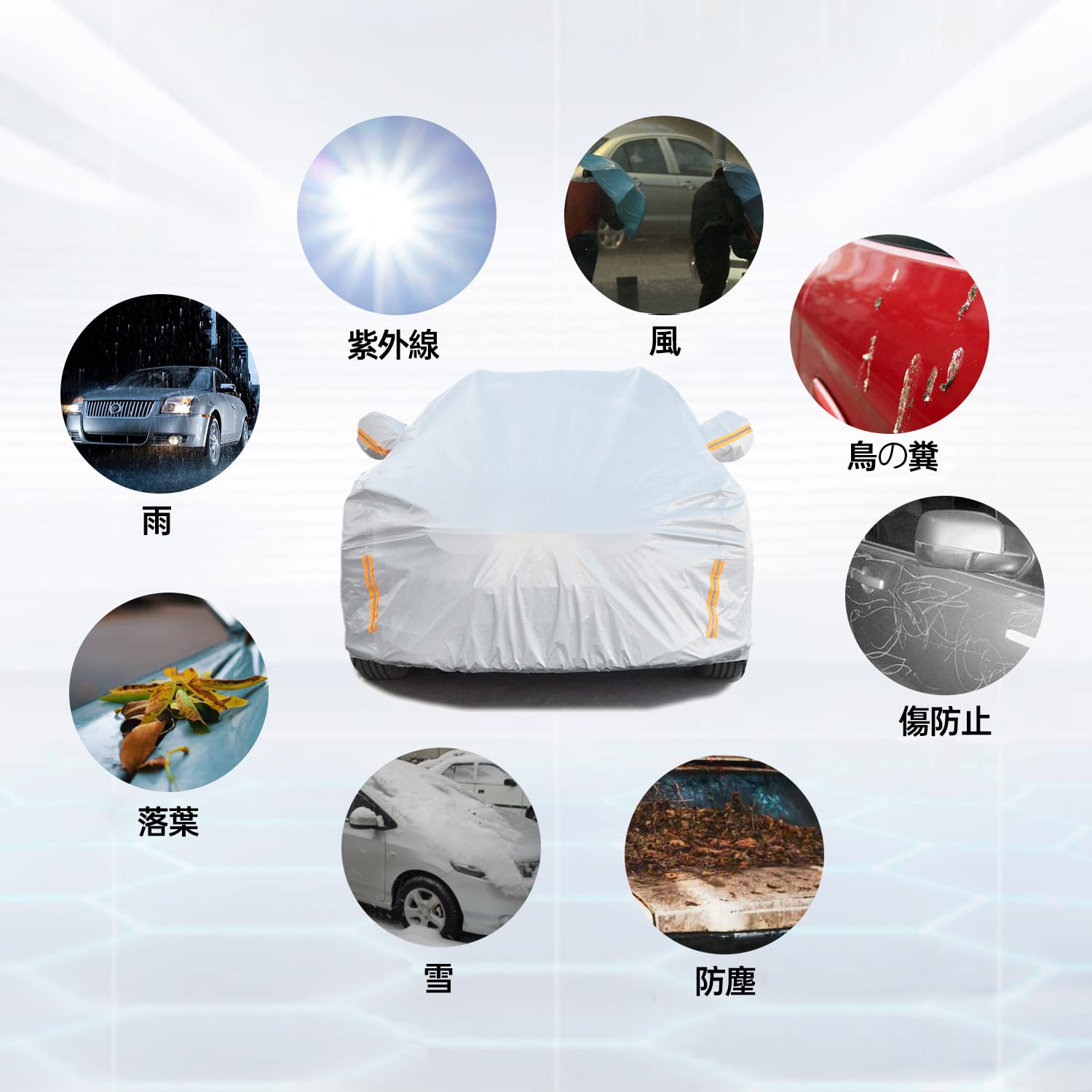 【優れたUV保護能力】通常の素材に比べ、本車カバーのアルミフィルム素材がより多くの紫外線を反射し、塗料を保護します。また、砂、鳥の糞、猫の足跡などから車体を保護することもでき、車の掃除の頻度を減らします。