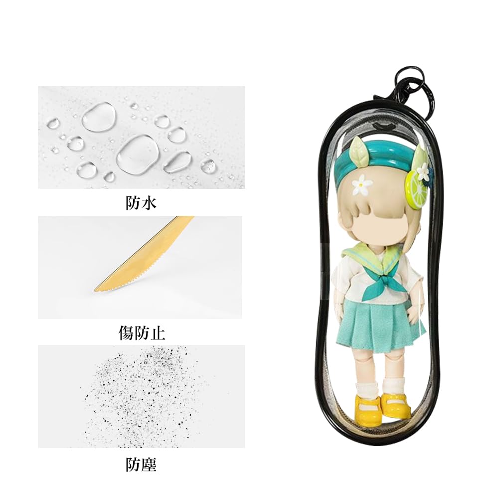 ?外観:可愛い楕円型人形入れポーチはPVCを採用して、耐久性があり、ジッパー式、両面透明。厚みのあるキーホルダーのフックはストラップで留め、キーリングはカバンにひっかけるデザイン。ポンポンボール付き、いらない場合は取り出してください。