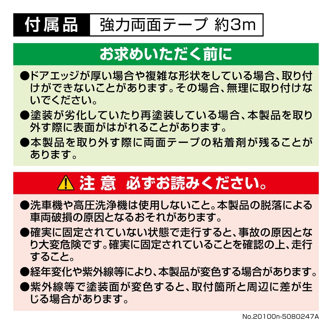 ・洗車機や高圧洗浄機は使用しないこと。本製品の脱落による車両破損の原因となるおそれがあります。