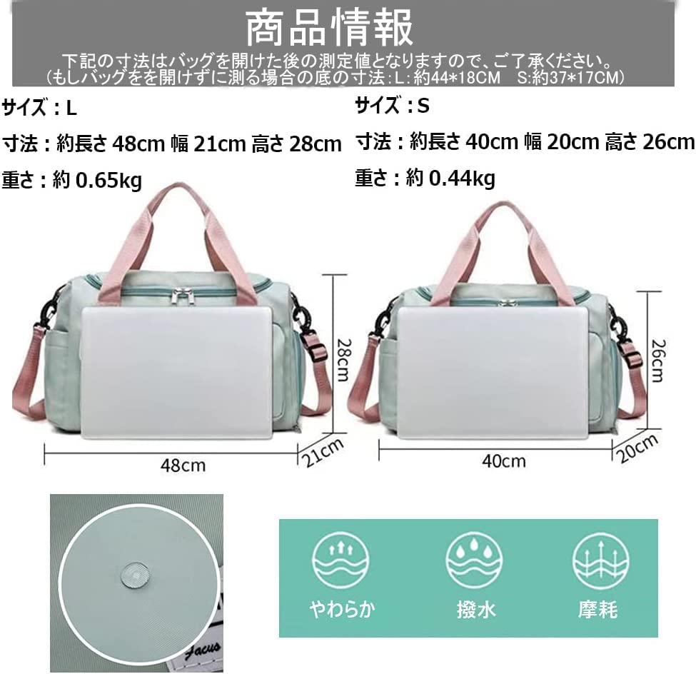 【ポケット設計】:外側6個(メインポケット1、シューズ収納ポケット1、フロントポケット2、サイドポケット1、裏ファスナーポケット1)、内側乾湿分離ポケット*1 合計7つのポケットがあり、服や洗濯用品など様々物をたっぷり収納できて非常に便利です。