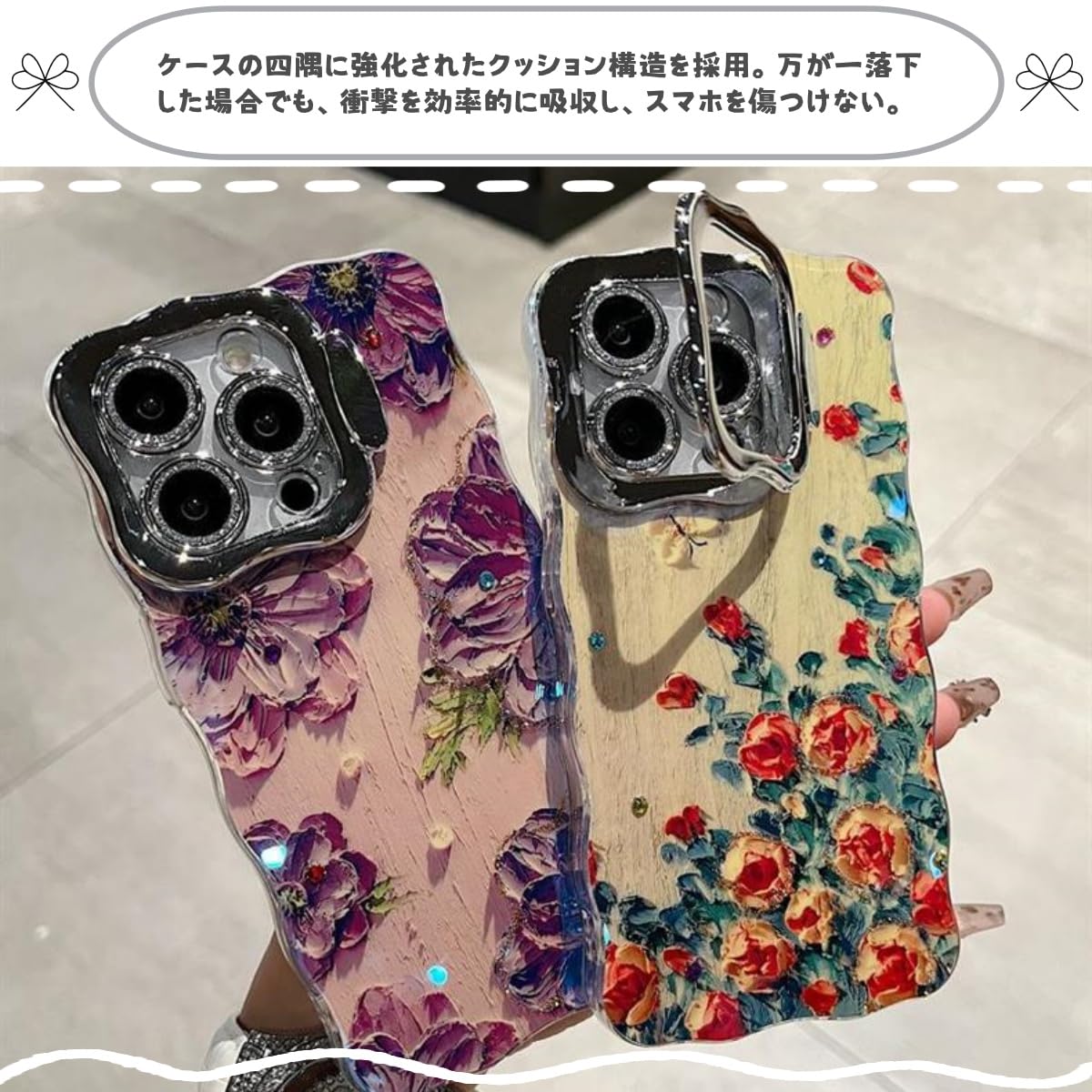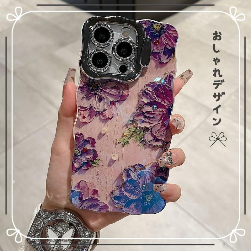 iphone16/iPhone15 14用ケース 人気スマホケース 油絵風 花柄デザイン レトロ おしゃれ キラキラ ブルーライト 光沢 波型 うねうね ウェーブ まるで立体的 3D 女子向け エレガント レンズカバーホルダ付き レンズ保護 耐衝撃 指紋防止 軽量 TPU (iPhone15パープル)