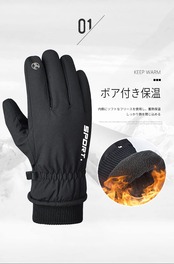 【高機能防風防寒素材】ポリエステル、合成皮革、TPU防水フィルム、導電性ファブリック、3Mシンサレート高機能断熱素材、フリース素材、ナイロン。【3Mシンサレート採用 高機能断熱素材採用 】撥水性の高い生地を表地に使用し、中にはTPU防水フィルムが配置され、防水性に優れています。3M社の衣料用断熱素材、シンサレートを採用しました。3M極細断熱素材は非常に細い繊維による高密度構造で、断熱性が高く、保温性にも優れています。手首まですっぽり覆っている伸縮性や密閉性を持つニットリブが採用され、ウエアの袖口との隙間を防ぎ、冷気の侵入をガードし、-20℃の真冬でもポカポカ。