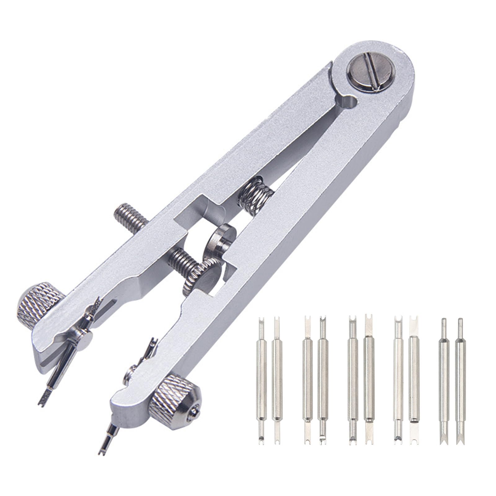 【使用範囲が広い】ツールには5セットのユニバーサル交換可能ピンフォークが含まれ。ピンフォークのサイズはさまざまなラグに適しており、いくつかの狭いスロットも操作できます。角度はペンチで調整でき、さまざまなスプリングラグの使用に適しています。あらゆるサイズの時計に適しています。