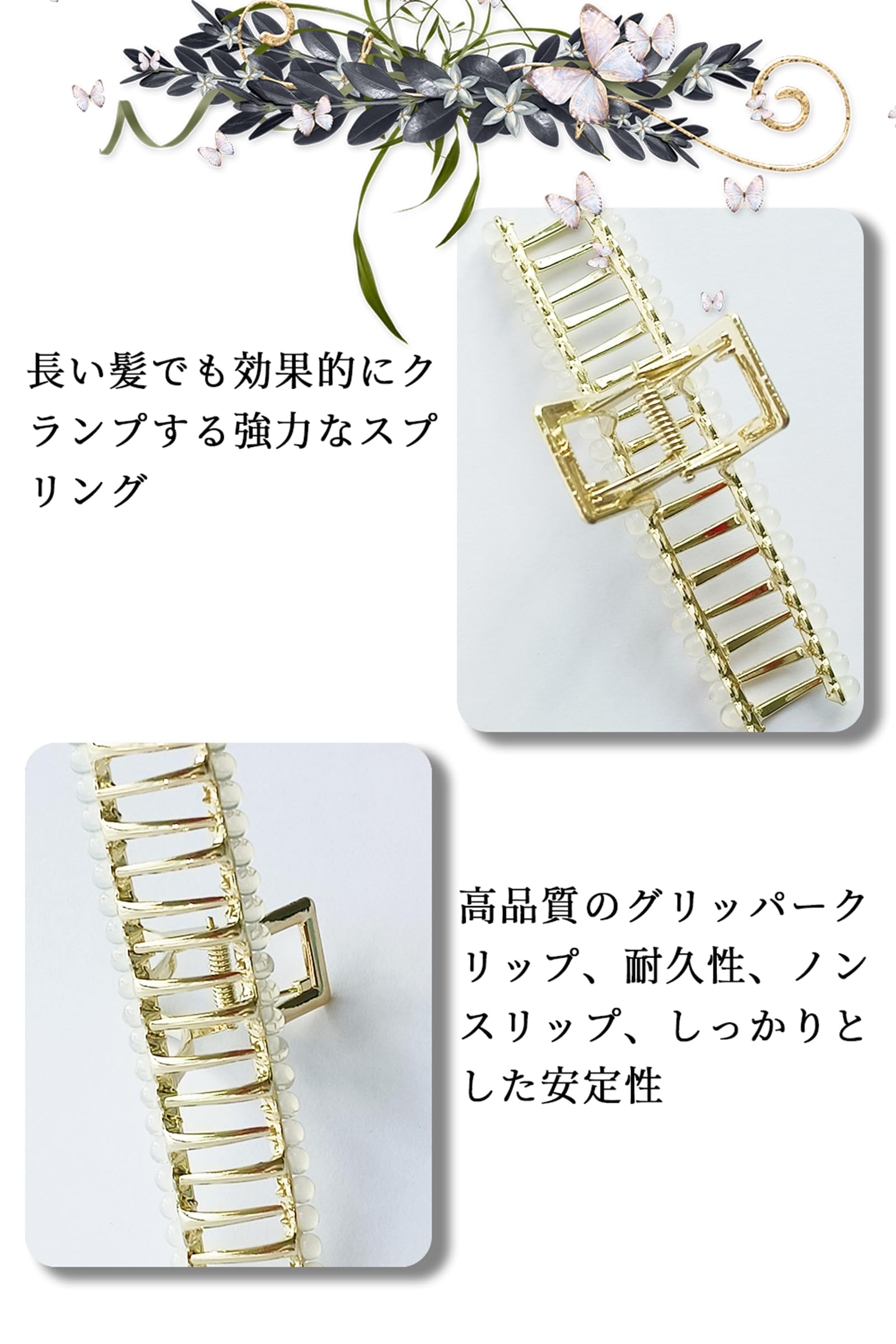 【便利な使用】:強力なバネと歯付きのクリップにより、忙しいメイクアップの時間中に、簡単で迅速にスタイリッシュで美しい髪型を作ることができます。優美な曲線を描くヘアクリップは、特に長くて太い髪の女性に向いています。