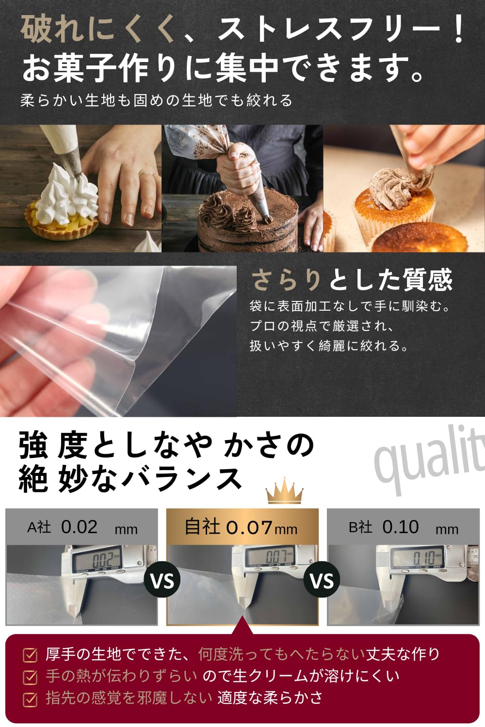★【絶妙な厚み】手の熱が伝わりずらく、手先の感覚を邪魔しないちょうどいい厚みの絞り袋を厳選。