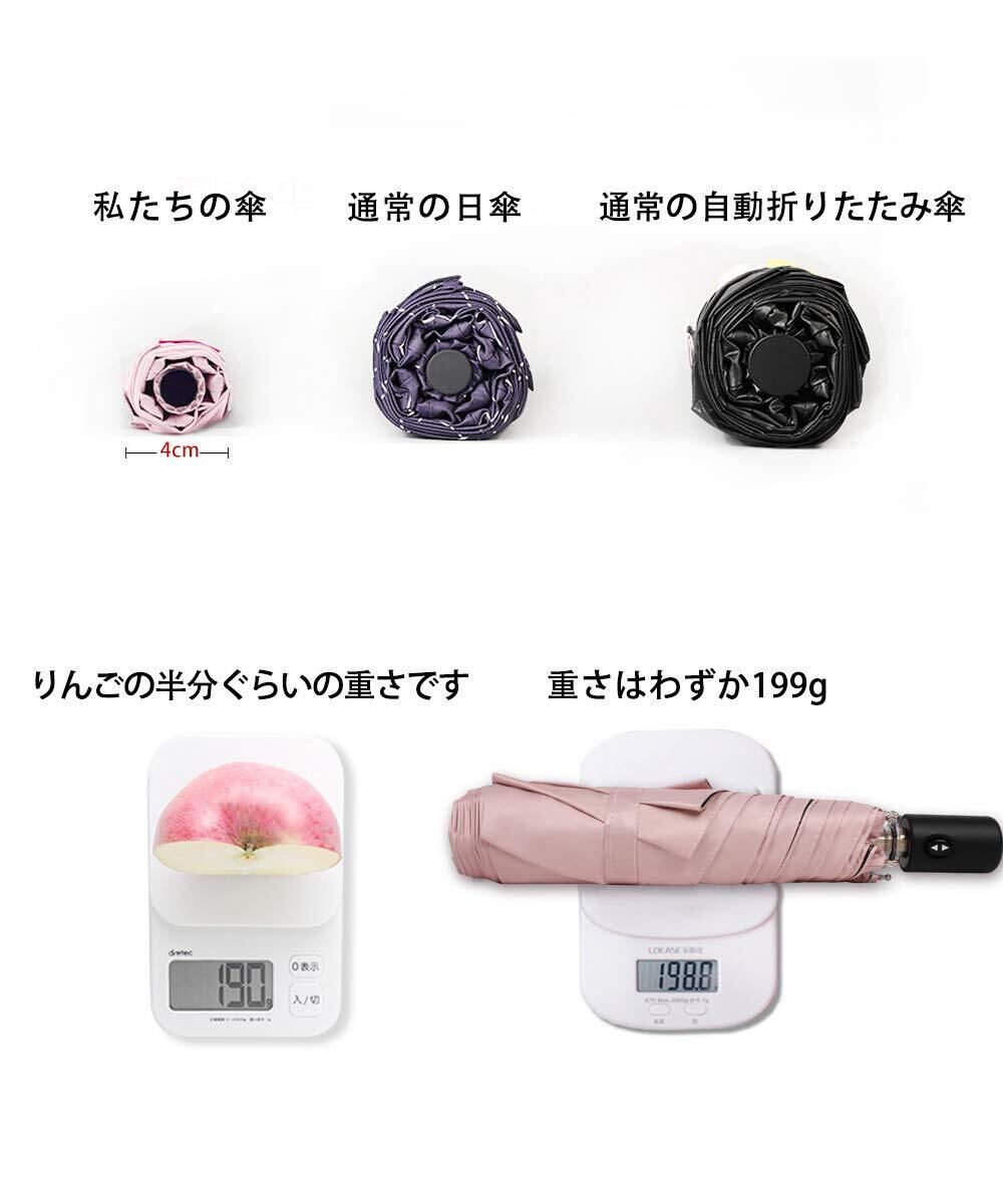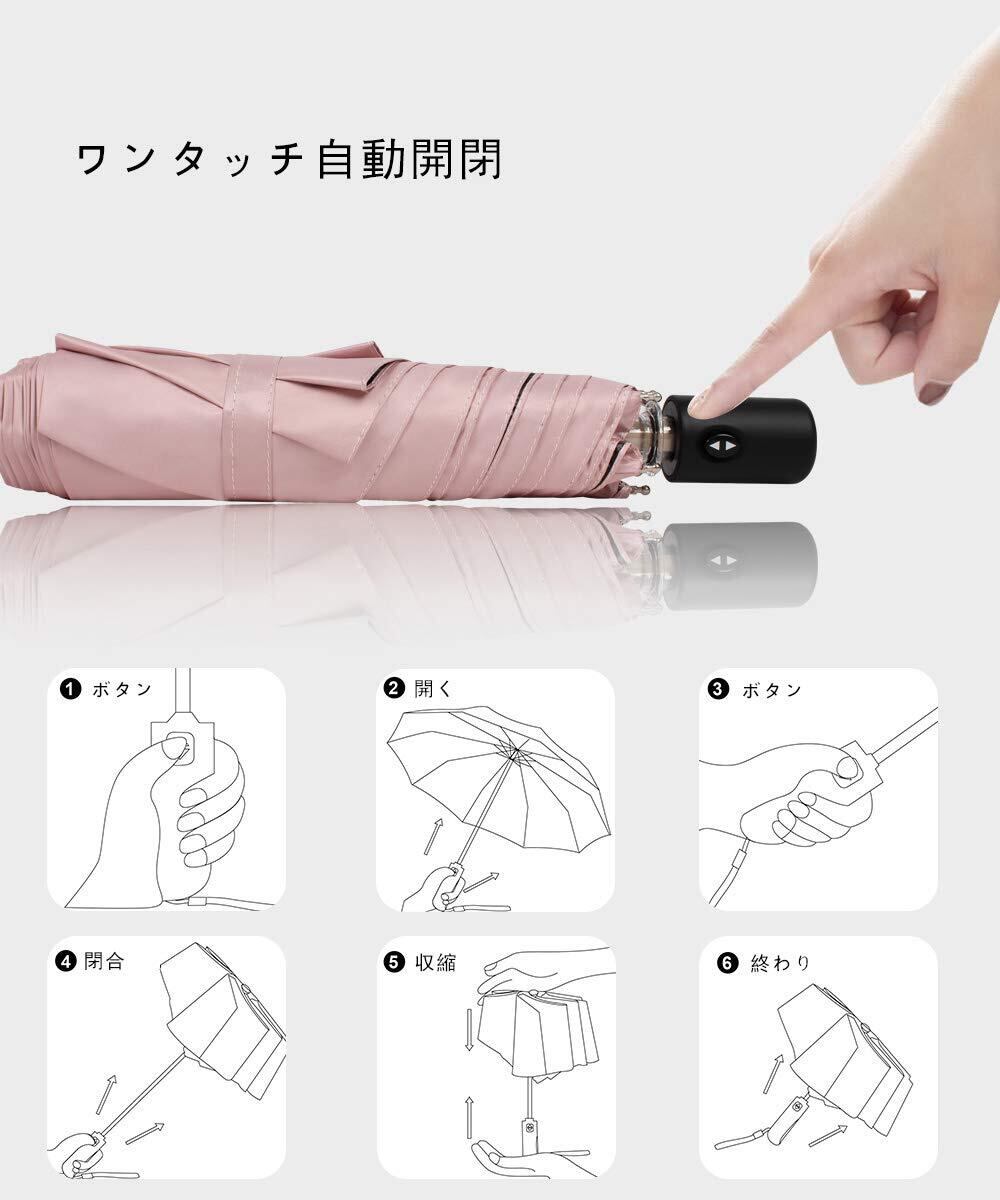 【超軽量折り畳み日傘】 自動開閉折り畳み日傘はガラス繊維と航空アルミ合金傘骨を採用するので、傘本体の重さは216gの軽量化に実現しました。普通の折り畳み傘の半分の重さしかないです、カバンに入れて常備しても負担になりません。持っていることを忘れるくらい、軽くて持ち運び便利!ショッピング途中や旅行をする時に有効な保護を提供します。