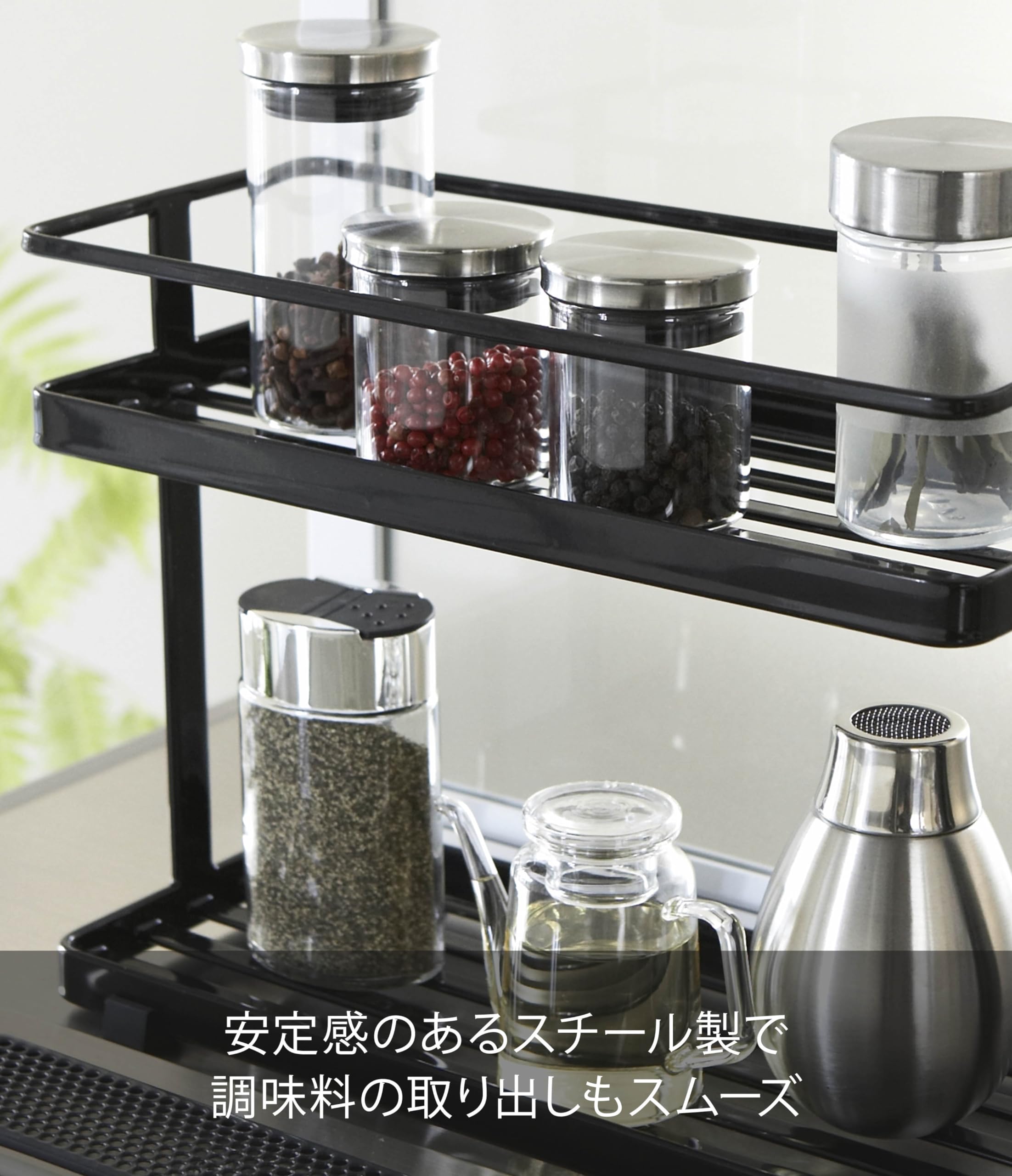 調理中に使用頻度の高い調味料などをまとめて収納できます。キッチン周りをスタイリッシュに演出するシンプルなデザイン。