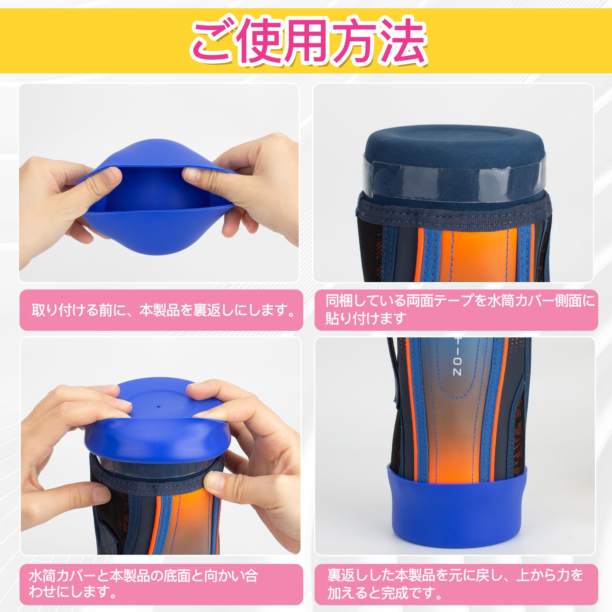 インストール方法:取り付ける前に水筒 底カバーを裏返しにしておき、 同梱している両面テープを水筒カバー側面に貼り付けます。 本製品とボトルの底面に合わせ、 裏返しした本製品を元に戻したら装着完了です。