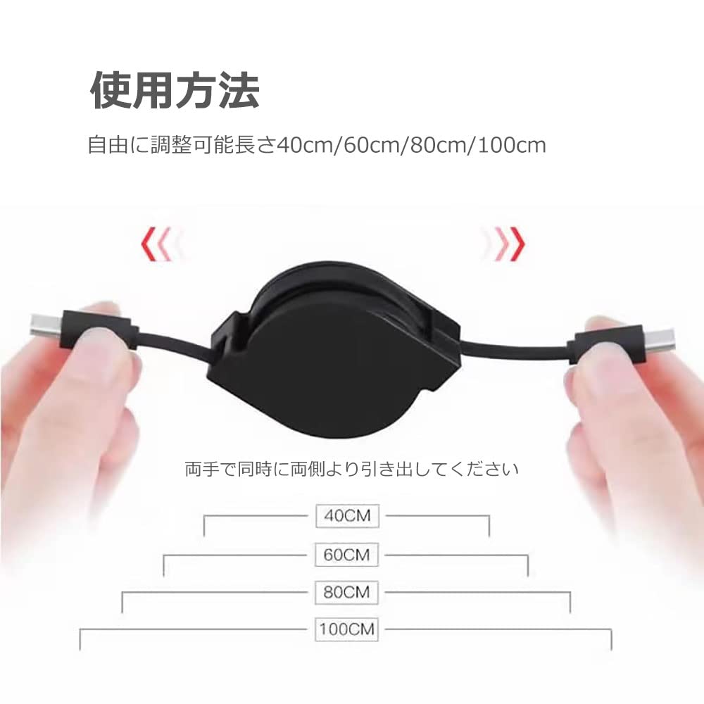 【巻き取り式充電ケーブル】pdケーブルの長さ自由に調整可能。最大約1Mまで伸長可能、最小約10cmまで収納可能。ご使用中、お好きな長さに調節することができます。ケーブルが絡まる悩みなく、収納も非常にコンパクトです。【使用方法】使用際に、両端を同時に引っ張って、必要な分だけ伸ばして使用してください。 収納際に、両手で両端まで伸ばすと、充電ケーブルは自動的に最初の位置だけ伸びます。