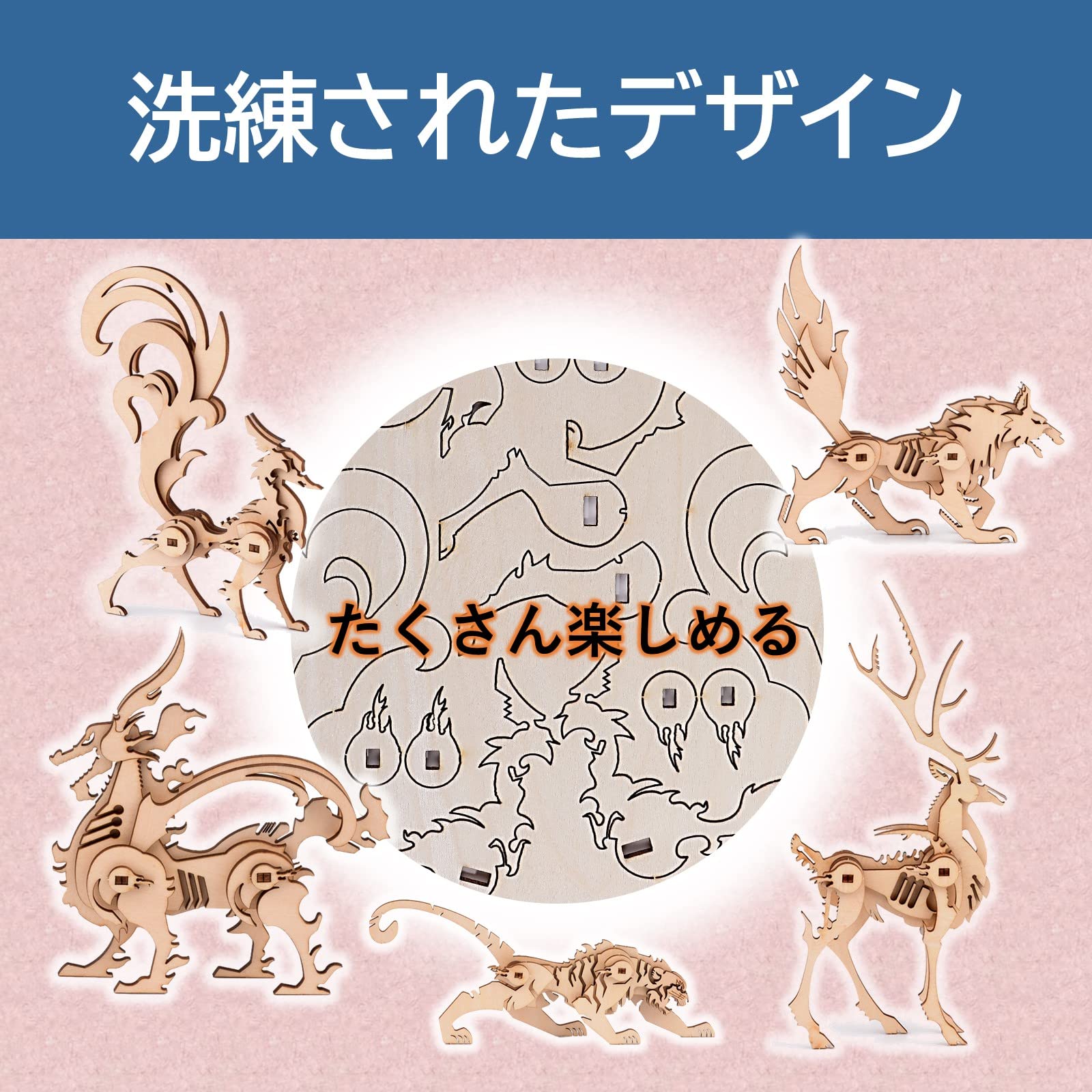 虎、鹿、狐、麒麟、狼の5種セットで様々なモデルのパズルを楽しめます。木製なので、色鉛筆や絵の具で色付けしてオリジナリティを出すこともできます。