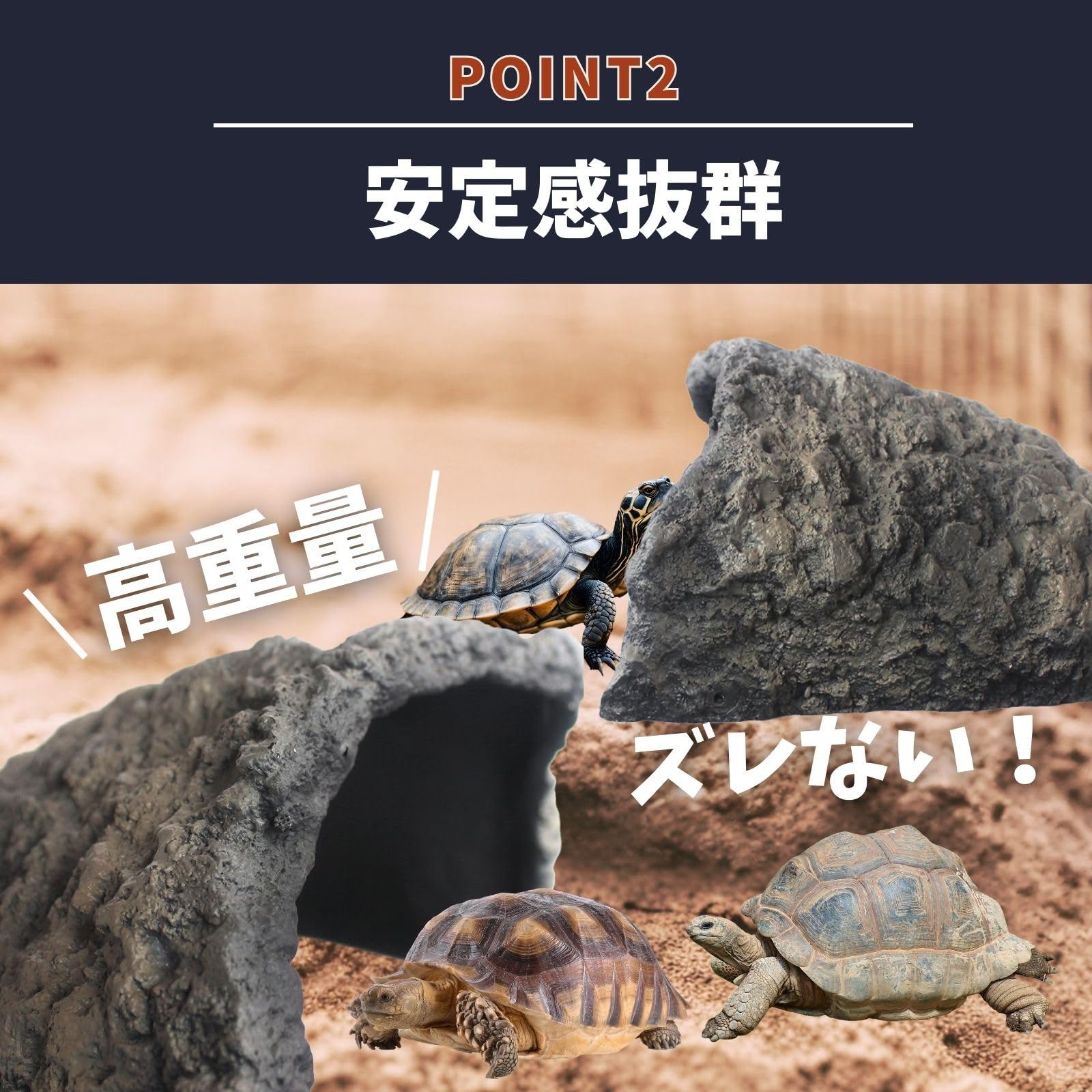 リアルな岩肌で自然な雰囲気:リアルな岩肌の造形が自然の雰囲気を演出し、リクガメが自然環境にいるかのような安心感を提供。ゴツゴツした表面は爪とぎや脱皮をサポートし、ペットの健康維持にも役立ちます。